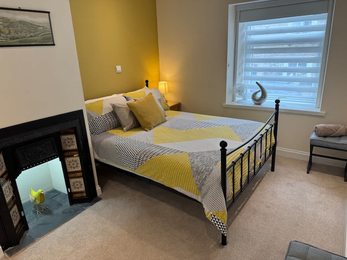 We furnished this little house with loving care as we stay here often. There's a comfy king size bed in the large bedroom upstairs. Downstairs is the living room with fireplace, a well equipped kitchen and a well appointed shower room. The view is breathtaking whether sitting on the steps with a glass of wine, eating at the table or in bed watching the lights of Hebden. There are a multitude of bars, restaurants and shops only five minutes walk away and beautiful river and hillside walks nearby.