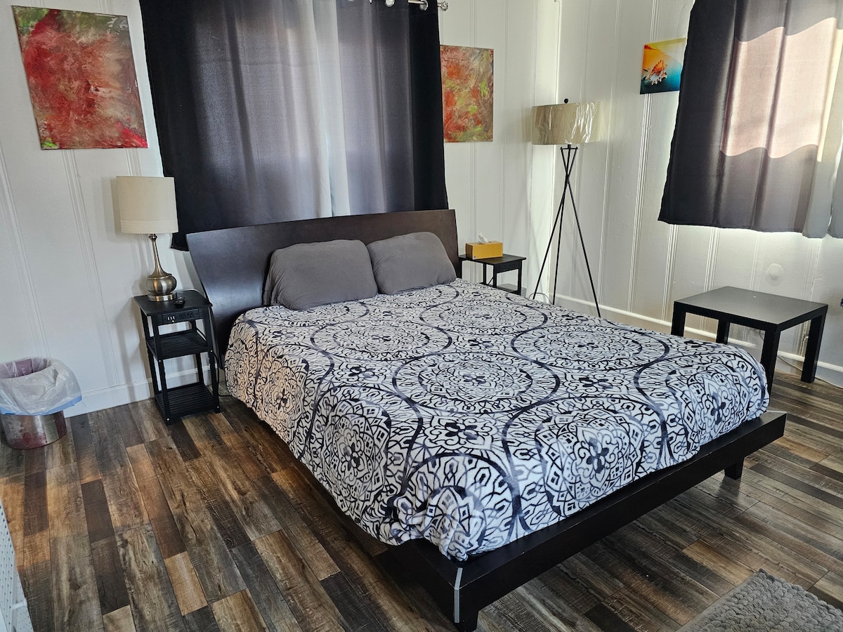 You will stay in a tranquil suite with a private entrance at the rear of our home. There is a shared wall with a secure door with locks on both sides for complete privacy. The 1-bedroom 1-bath suite features a kitchen with air fryer/toaster oven, electric skillet, 2 hot plates, microwave, refrigerator, and dishwasher. Sofa full size converts to sleep two. This sofa bed in the living room provides additional sleeping. We can provide a twin size aero bed as well.