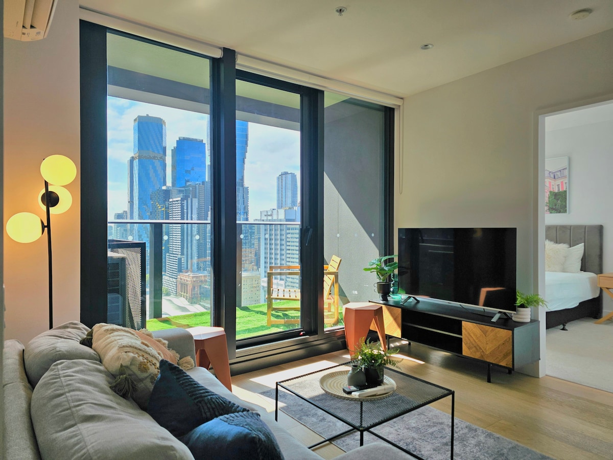 Enjoy a clean, relaxed experience at this centrally located place. Try the top floor! In Melbourne CBD this place really stands out. Phenomenal sunsets! Unencumbered views to the bay, rivers, Docklands, WestGate & Bolte Bridges, distant hills, city lights. Convenient. Walk to Crown, ConventionC, Marvel Stadium, Southern Cross Station, il Mercato Centrale. Great amenities: Pool/spa/sauna/gym. 1x Quality queen bed + Quality 2x sofa beds, linen, Hot shower, Kitchen, Ergonomic Desk, AppleTV