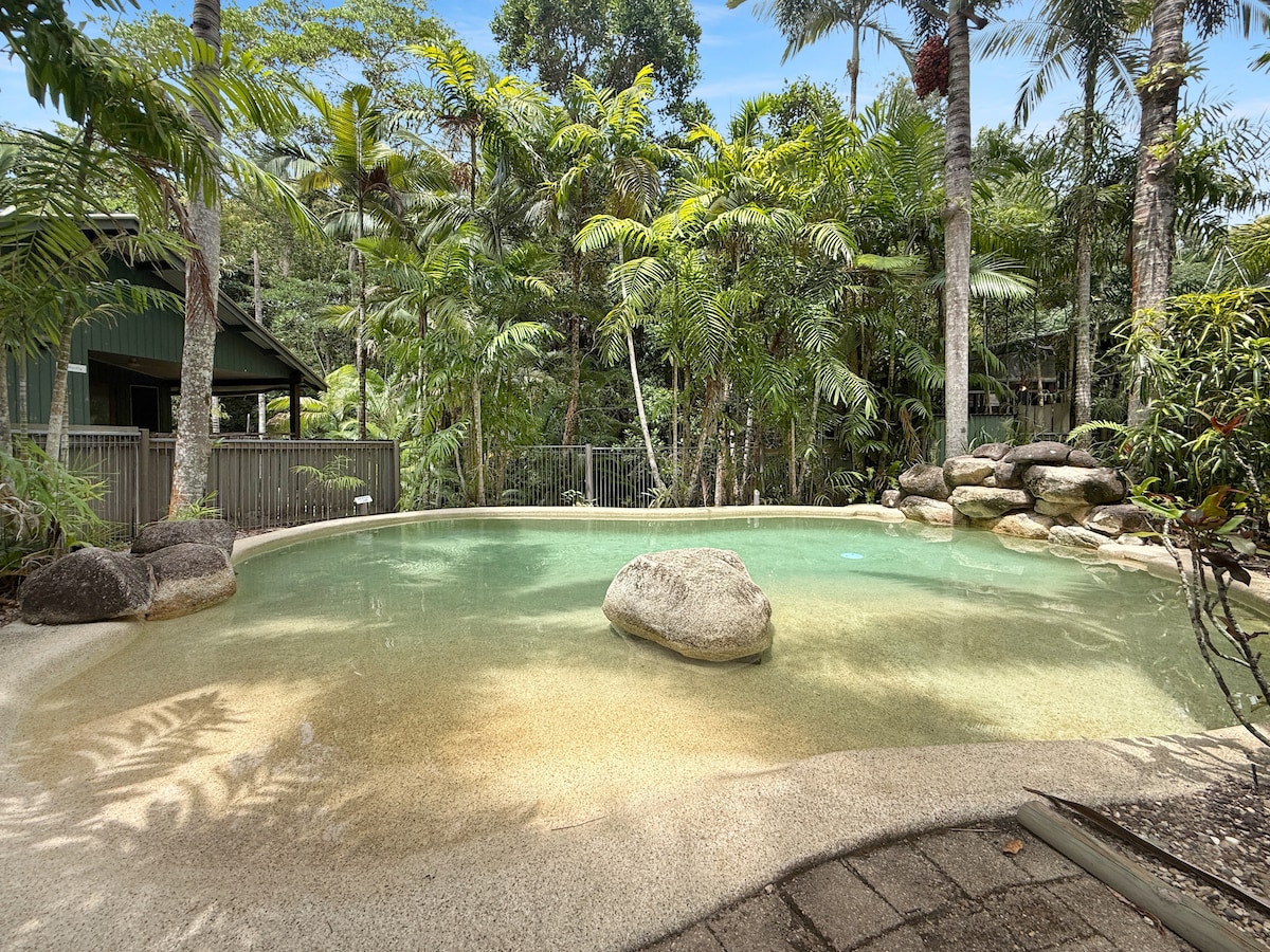 Adjoined by rainforest, our place is handily positioned between beautiful Bingil Bay Beach (200m) and the wonderful Bingil Bay Café (200m). The accommodation is the bottom part of a large Queenslander house with access to the pool and extensive gardens. With its own access and carport you are completely self sufficient but we are available to lend you bicycles or point you to the walking tracks. Be active or do nothing, we are private but not remote.