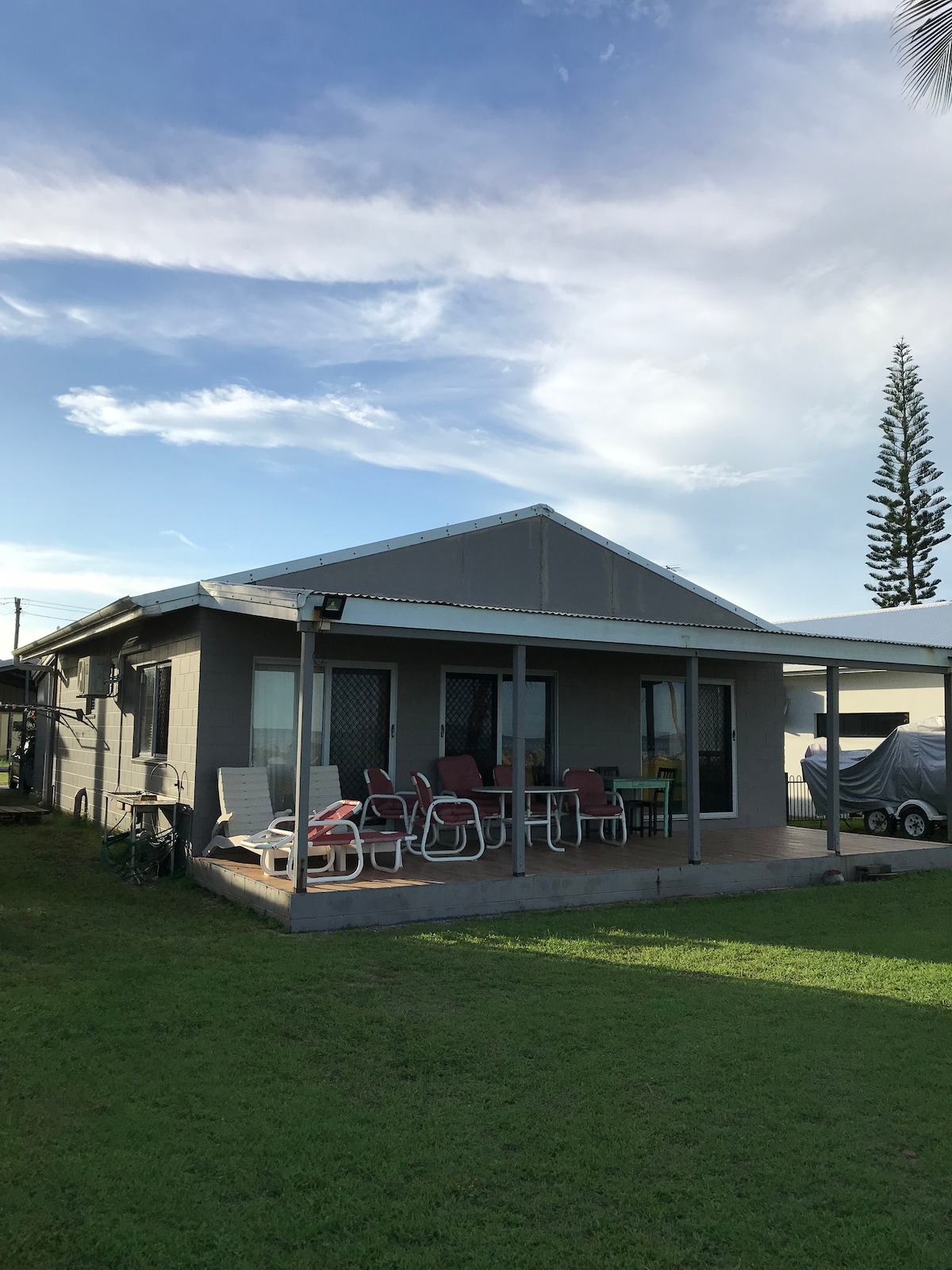 Welcome to your perfect beachfront getaway! New 2-bedroom ( ensuites) beach house with ocean/island views from every room. Hear the waves under a sky full of stars. Peaceful, quiet location with picture-perfect views all day long. Local park offers pool access for $2 per guest.Enjoy morning coffee or evening drinks on the deck, stroll along the beach,simply soak it all in. Great food at local pub, takeaway nearby, supermarket 20 mins. Bring your boat. Unwind and reconnect with coastal life