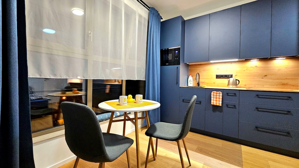 Marble,concrete,wood,stainless steel,wool-these are the materials from which we created a unique interior. We furnished the apartment with carefully selected design pieces. In the coffee corner there is an Italian coffee machine , a Bialetti pot and a Hario V60 . If you don't feel like making coffee at home, there is a bakery and cafe right next to the reception. The stay includes the possibility to visit the fitness and sauna, take a yoga class or go for a massage.