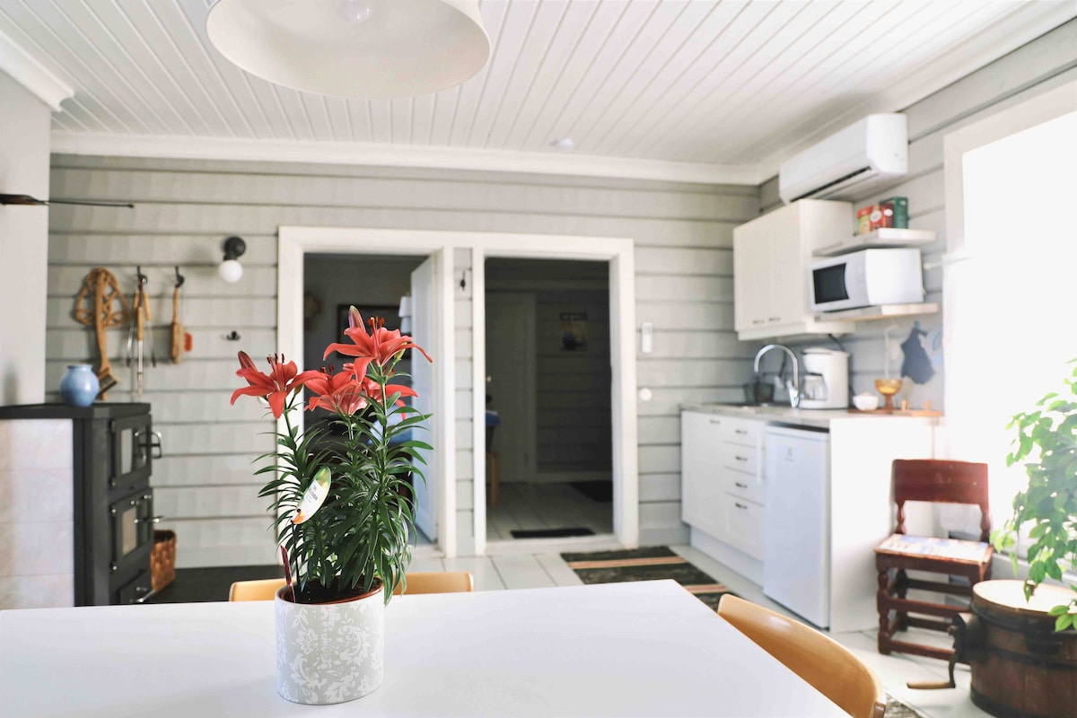 Renovated guest house with antique interiors in a quiet and peaceful village 18 km outside Uusikaarlepyy and 2km from route E8. My great grandfather built both the guesthouse and the main building in the 1920's. Since then the main building has served as the village school, my grandfather's home and since the 90's it has been my childhood home. Swedish / Finnish / English