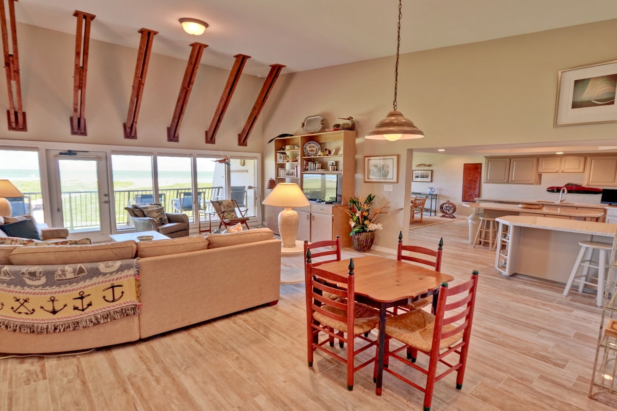 Top floor beachfront condo just steps from the ocean!! You’ll love my place because it will not feel like a rental, has the best location on the Island, breathtaking panoramic views, remodeled kitchen, grill, 2 pools ( 1 heated in the winter), 2 hot tubs, 2 tennis courts, fully equipped kitchen, comfortable beds, washer and dryer, dishwasher, 3 LCD TV's, upgraded premium Broadband internet and Wi-Fi throughout, gated parking lot and elevator. The views from the top floor are out of this world!