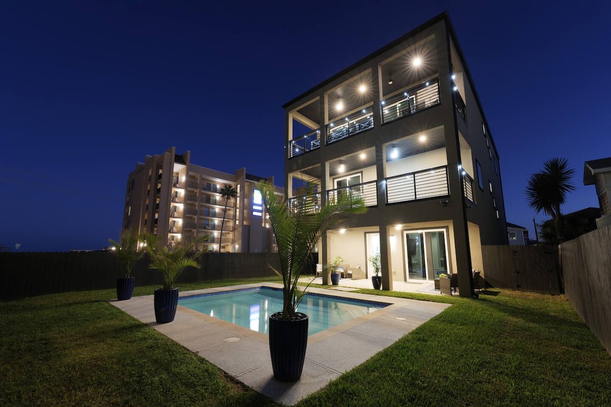 Indulge in the pinnacle of island living at our Crown Jewel in South Padre Island. Impeccably designed with five bedrooms, each a master suite with attached baths. Elevator access, poolside retreat, and fully stocked gourmet kitchen. Panoramic ocean views from the third-floor living space and private balconies. Unwind in style with family and friends, steps from the public beach. Contemporary elegance and thoughtful design redefine your South Padre experience. Your island retreat awaits.