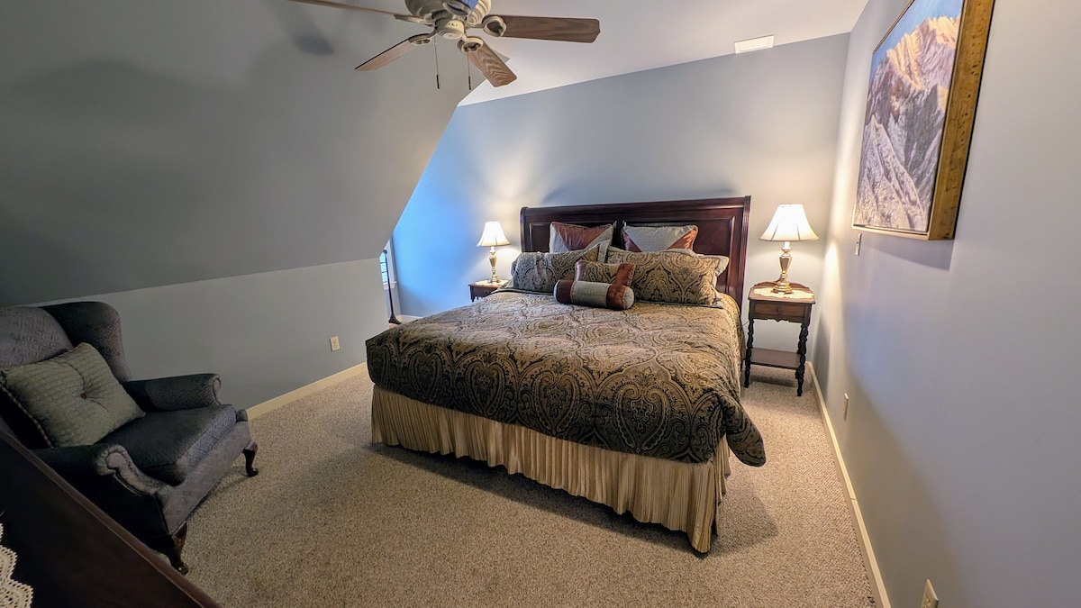 Our Crows Nest Suite, located on the second floor, features a generous oak wet bar, counter seating for two, and an oak paneled built in sectional sofa that can double as a sleep area for one adult or two small children. Skylights fill this space with natural light and offer birds eye views of the Observatory. Cobalt blue upholstery and shower tile add pop and contrast to its warm wood built ins, bright original artwork, and plush wool area rug.