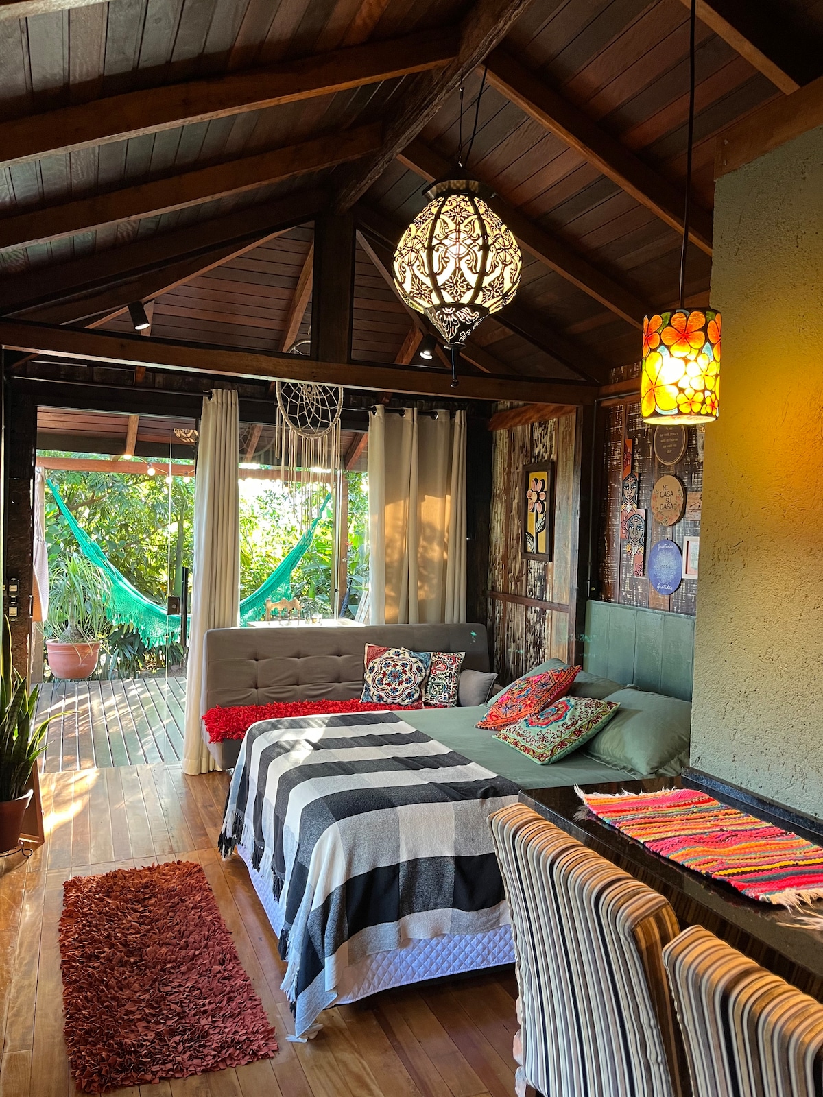 Com um estilo próprio e cheia de charme, nossa cabana combina a rusticidade da madeira com detalhes delicados que criam uma atmosfera calorosa e envolvente. Aqui, cada momento se transforma em experiência: assistir ao pôr do sol refletindo sobre a água, relaxar com o som da natureza ou simplesmente aproveitar a beleza do lugar em boa companhia. Um espaço único para quem deseja desacelerar, se conectar e viver dias inesquecíveis a dois.