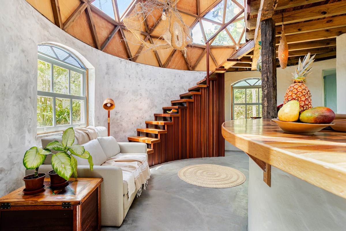 ♥ Reconecte-se em um de nossos Domos Geodésico no Recanto Pedra Maya em Garopaba. ★ Lareira ★ 10 min de carro da praia ★ 15 min da Surf Land ★ Cachoeira a 1 minuto do Domo. ★ Churrasqueira na varanda ★ Cozinha completa ★ Aquecimento e ar condicionado ♥ Aproveite os espaços externos compartilhado: Piscina com seixos de rio, cachoeira, área para fogueira. ♥ O Domo Fogo traz uma abordagem do moderno e rústico com conforto, privacidade, uma vista linda pra mata e som da cachoeira.