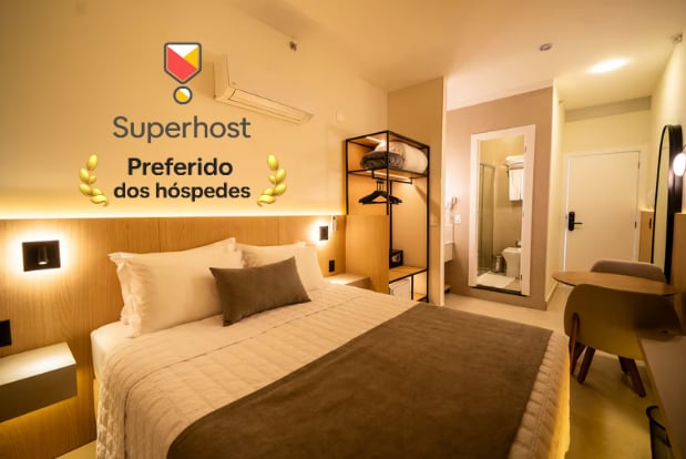A suíte contém uma cama de casal Queen. Possui Wi-Fi, ar-condicionado, TV smart e cofre. O banheiro privativo inclui toalhas, shampoo, condicionador, sabonete e secador de cabelo. O complexo está localizado na Avenida das Cataratas e oferece facilidades para sua conveniência. No prédio, você encontrará lavanderia self-service, casa de câmbio, agência de turismo, locação de veículos, Subway e conveniência 24 horas com caixa eletrônico para operações bancárias a qualquer momento.