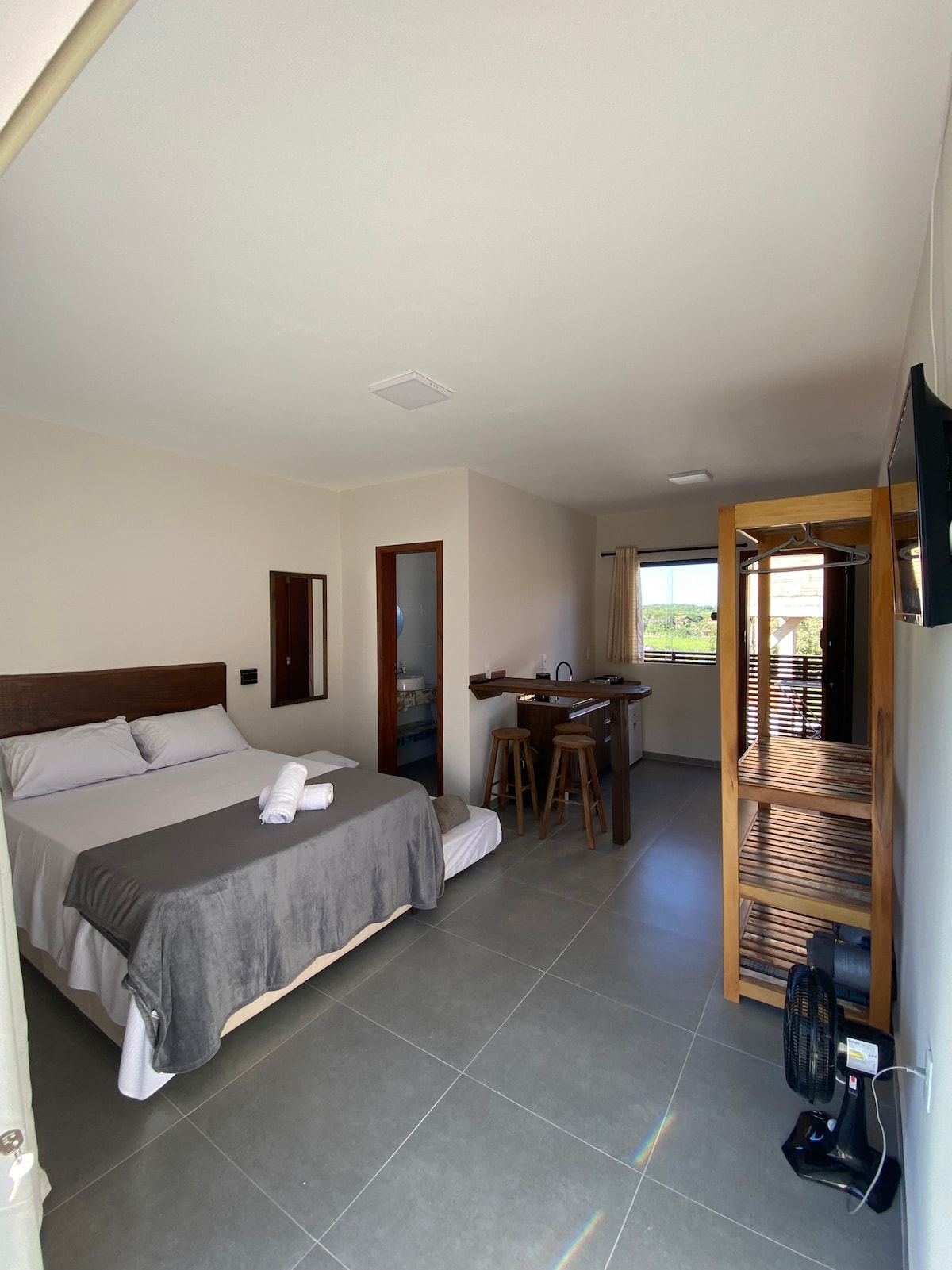 Flat para até 5 pessoas, quarto, cozinha completa totalmente equipada, sala com dois ambientes e lareira. Possui tv a cabo e wi-fi gratuitos. O condomínio possui infraestrutura espetacular, com academia, espaço kids, sauna, piscina aquecida, solarium, espaço com lareira, mini market 24h, lavanderia e uma linda vista da Catedral de Pedra. E o melhor de tudo, serviço completo de hotel, recepção 24h e serviço de quarto, para você curtir sua estadia sem preocupações.