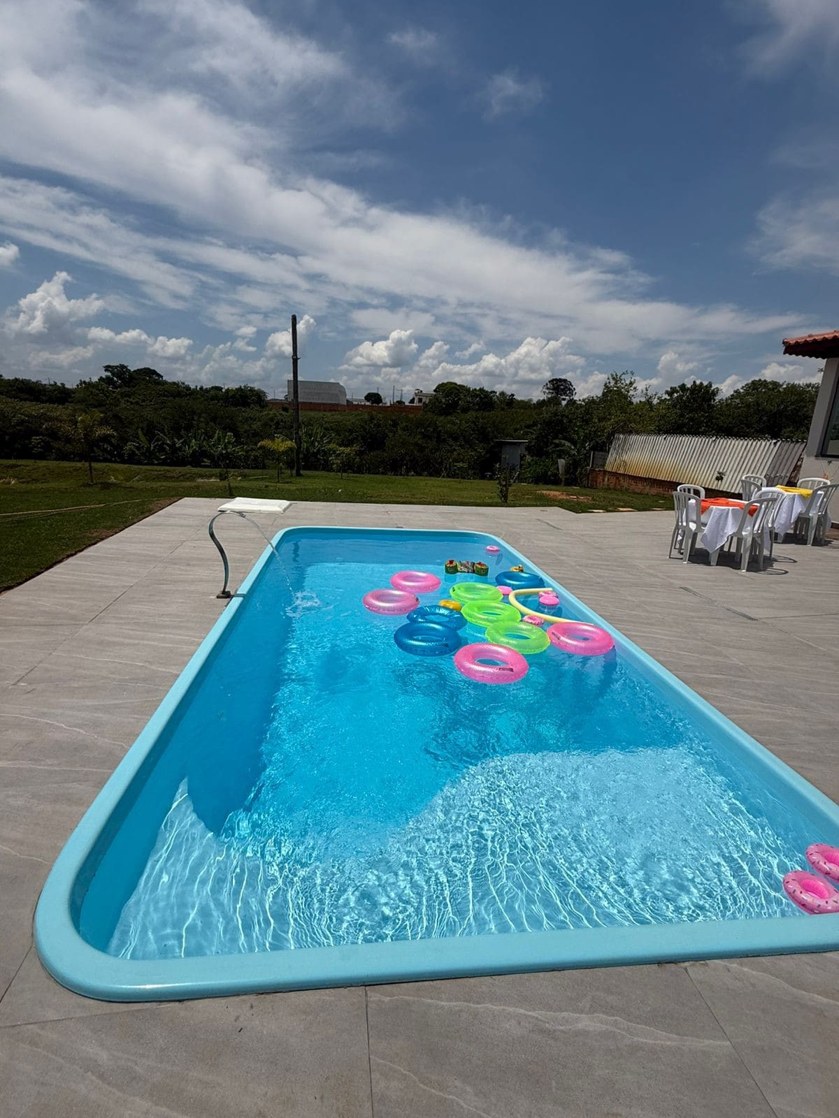 Espaço de lazer! Quiosque completo com piscina. Nosso espaço foi pensado para um dia de lazer em família ou amigos. No quiosque tem banheiro com chuveiro; Na área da cozinha tem a bancada com pia e fogão; Refrigerador e churrasqueira. Ficam disponíveis pratos, copos, talheres e espetos; A pátio é totalmente cercado, A piscina é aquecida por placas solares (sendo necessário sol para aquecê-la);