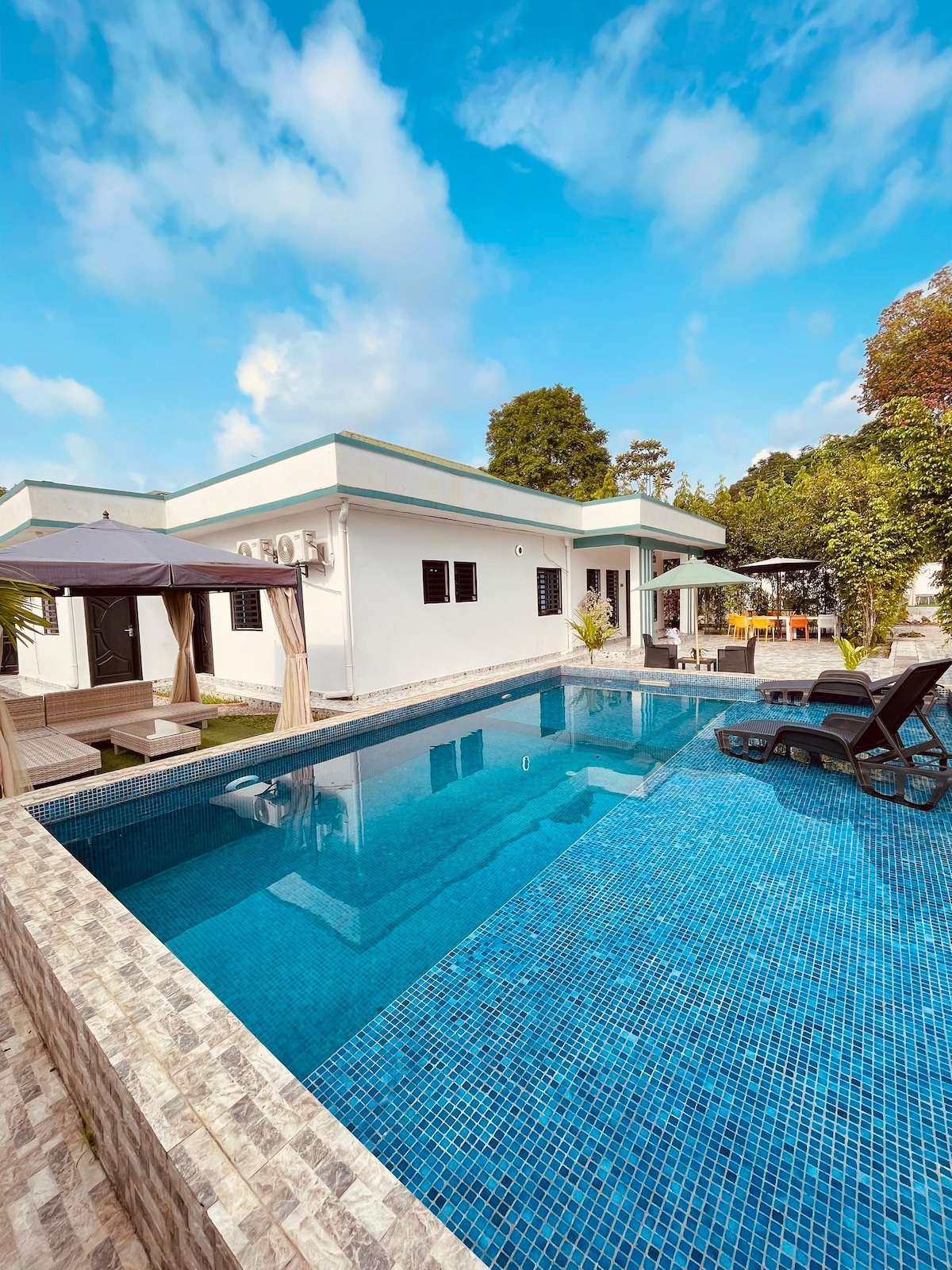 Experience resort-style living at Brillasol’s 5-bedroom villa, just minutes from La Lobé Waterfalls in Kribi. Enjoy a large private pool with sun loungers, shaded pergola, and outdoor dining area overlooking lush greenery for the perfect tropical escape. Inside, marble-style floors, designer lighting, and comfortable leather sofas create a modern lounge, while five elegant bedrooms with quality bedding and rainfall-shower bathrooms offer hotel-level comfort for families and groups.