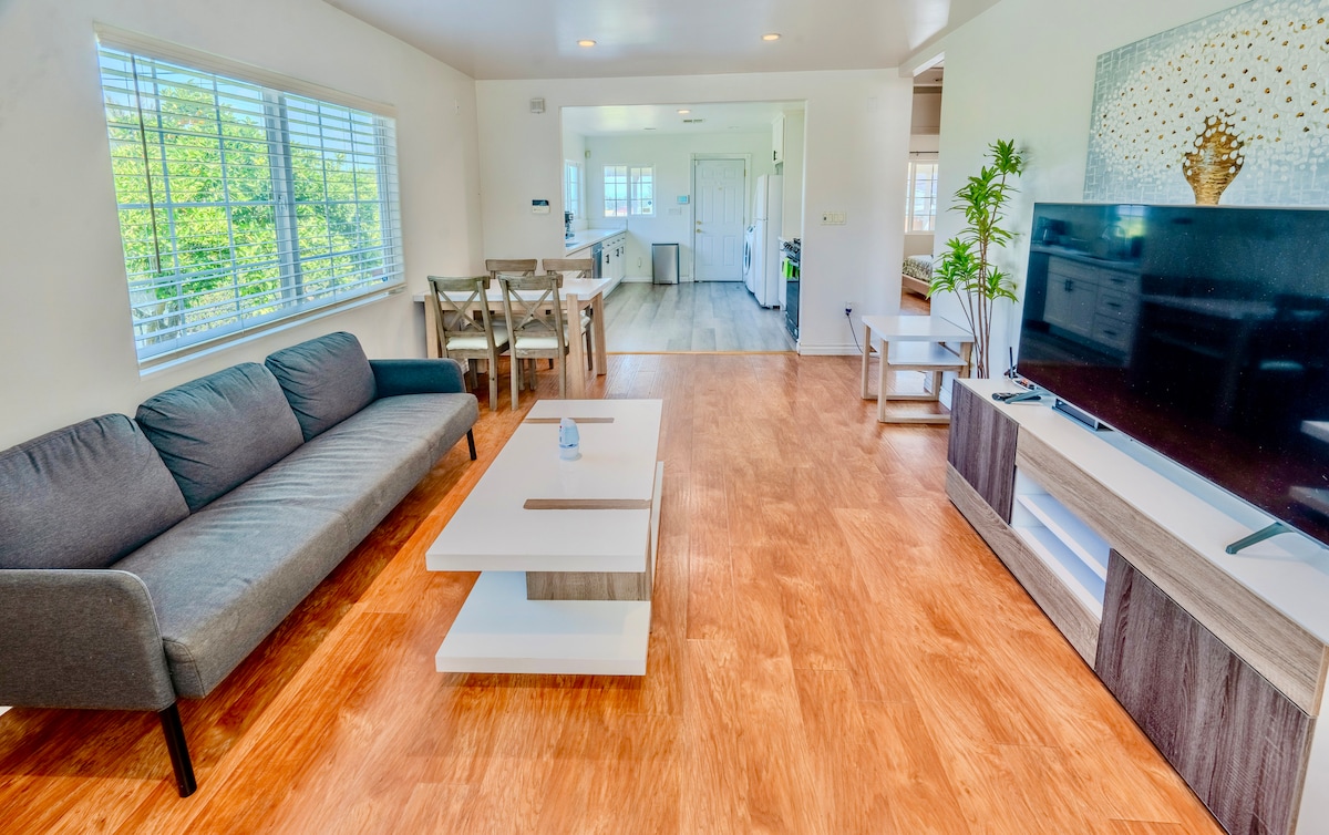 This is a fully renovated 1 bedroom back house on the quiet hilltop. There are a lot of restaurants and supermarkets within a 5-10 mins drive. Most appliances are new. Two 55" 4K TVs in the unit. The brand-new kitchen has a gas range, dishwasher, and island counter. The Central AC throughout the house. The house is gated with free parking. The washer and dryer are in the backyard and free to use. It's about 14 miles to LA downtown, 22 miles to Universal Studio, and 26 miles to Disneyland.