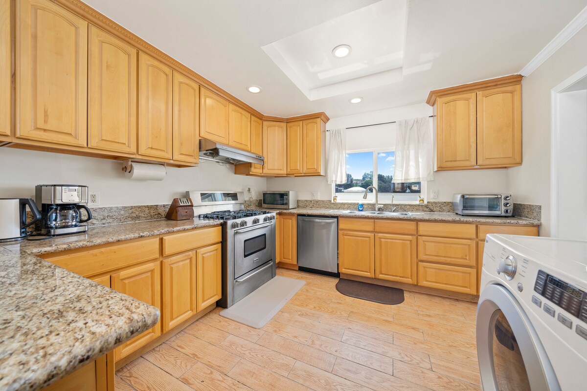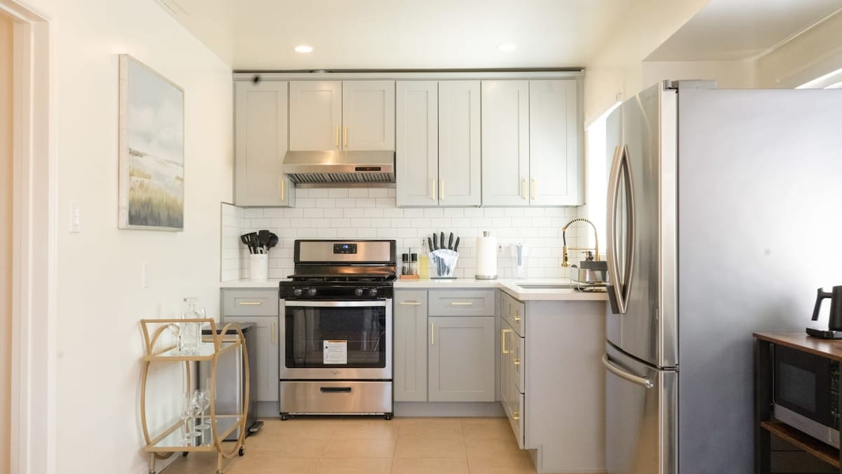 This is a fully renovated 1 bedroom back house on the quiet hilltop. There are a lot of restaurants and supermarkets within a 5-10 mins drive. Most appliances are new. Two 55" 4K TVs in the unit. The brand-new kitchen has a gas range, dishwasher, and island counter. The Central AC throughout the house. The house is gated with free parking. The washer and dryer are in the backyard and free to use. It's about 14 miles to LA downtown, 22 miles to Universal Studio, and 26 miles to Disneyland.