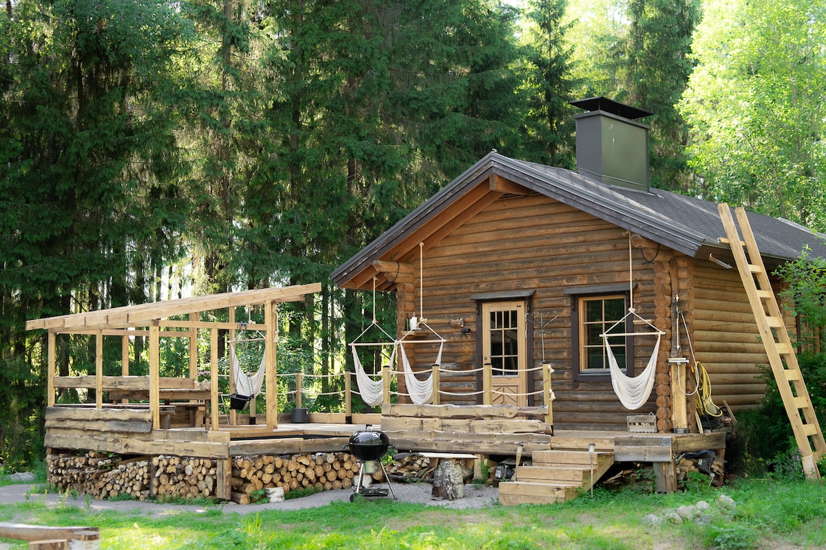 Hirsimökki on remontoitu uniikisti ja piha on täynnä tekemistä! Käytössänne on heti valmis-poreallas (2 aik. + 2 las.) & keinusauna! Hulppea terassi ja loftnet. Kesäisin beach volley kenttä ja olympiatrampoliini. Suosittu Hirvikartano sijaitsee 130km päässä. ALAKERTA: Keittiö, olohuone ja sauna YLÄKERTA: 2 makuutilaa 2:lla parvella Mökin alakerta 40 neliötä + terassi 20 neliötä. Wifi on! Täydellinen "getaway" luonnon rauhaan pariskunnalle tai ystävien kesken! #kuuntelehiljaisuutta