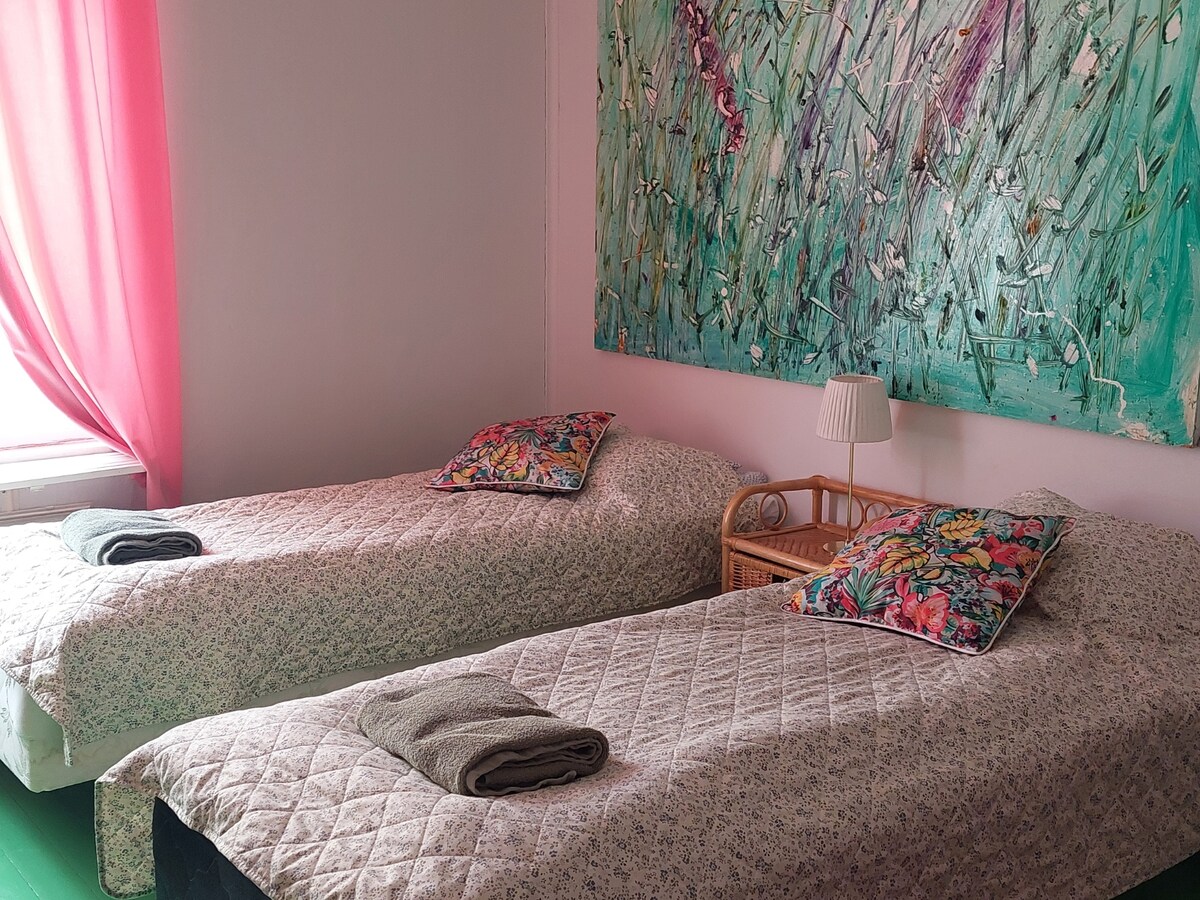 Huoneisto entisen kyläkoulun suojaisassa päädyssä. Huoneistossa tupakeittiö, avoin makuuhuone ja kylpyhuone. Makuupaikka neljälle. Parisänky makuuhuoneessa ja levitettävä sohva olohuoneessa. Huoneistossa on opettajan koroke ja ulkoportaat, ei ole siis esteetön. Ulkosauna lämpenee lisämaksusta. Asunto sijaitsee rauhallisella alueella, 8km keskustasta. Muu osa rakennuksesta on majoittajan omassa käytössä. Pihalla on tilaa oleskella ja esim. grillata. Sopii hyvin myös lapsiperheille.