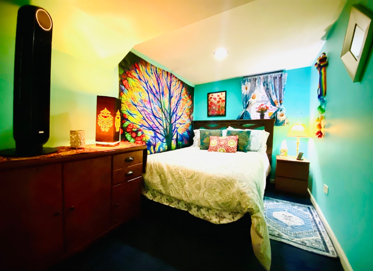Enjoy this fun and unique 1-bed 1.5-bath speakeasy in the heart of Chicago's Bronzeville District. This artsy vibe features eclectic décor, hand-painted murals, Smart TVs, wet bar, wellness studio, remote workspace, free street parking, and ground-level-step-free access. This cozy space is perfect for fun couples, solo adventurers, business travelers, and game night aficionados. Easy access to Downtown (6 miles to Mag Mile, Navy Pier, Millennium Park), Beach (1 mile), Museums, & Sports arenas.