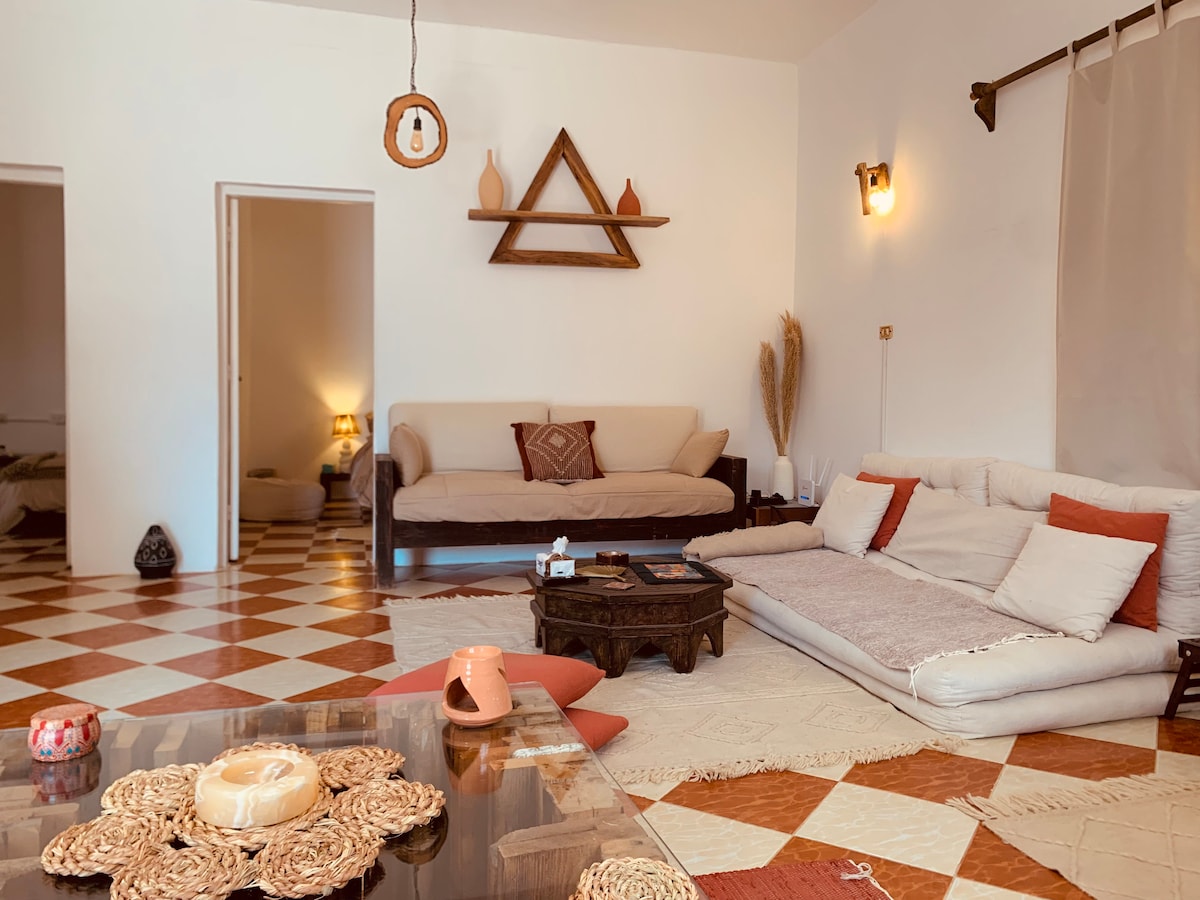 Welcome to your cozy home away from home in Dahab! Located on the first floor, the ‘Sea’-through apartment offers beautiful views of the sea through palm branches and sun rays, just as the picture shows. This spacious 1-bedroom apartment is filled with handmade furniture and accessories that reflect the organic and natural lifestyle we love in Dahab. Situated on the second line directly by the beach, it’s just a 3-minute walk to Assala market and a 10-minute walk to the Lighthouse.