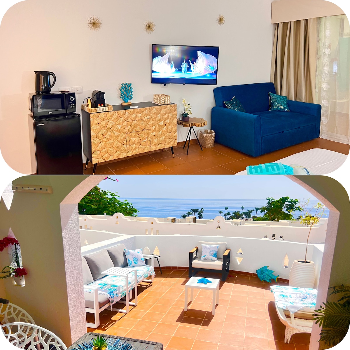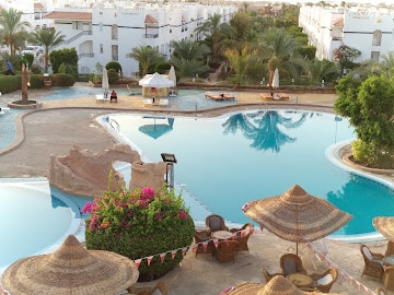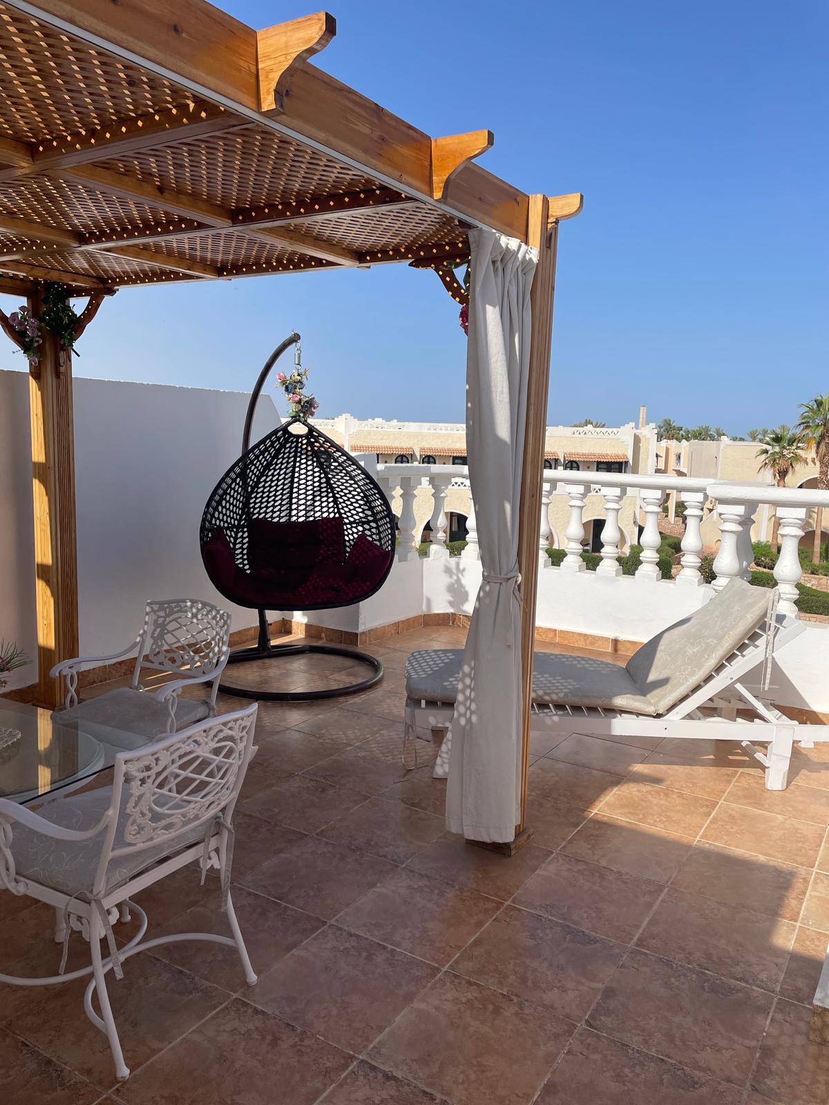 This modern apartment, meeting European standards, is located in the heart of Sharm El Sheikh, within the Delta Sharm residential complex. The terrace overlooks a peaceful pedestrian area lined with palm trees, with two pools nearby, and access to 9 pools. The apartment is quiet, air-conditioned, and fully equipped with a washing machine, electric stove, and microwave. Ideal for two people, couples, or friends, but not suitable for children or pets. We offer private airport transfer for €10.
