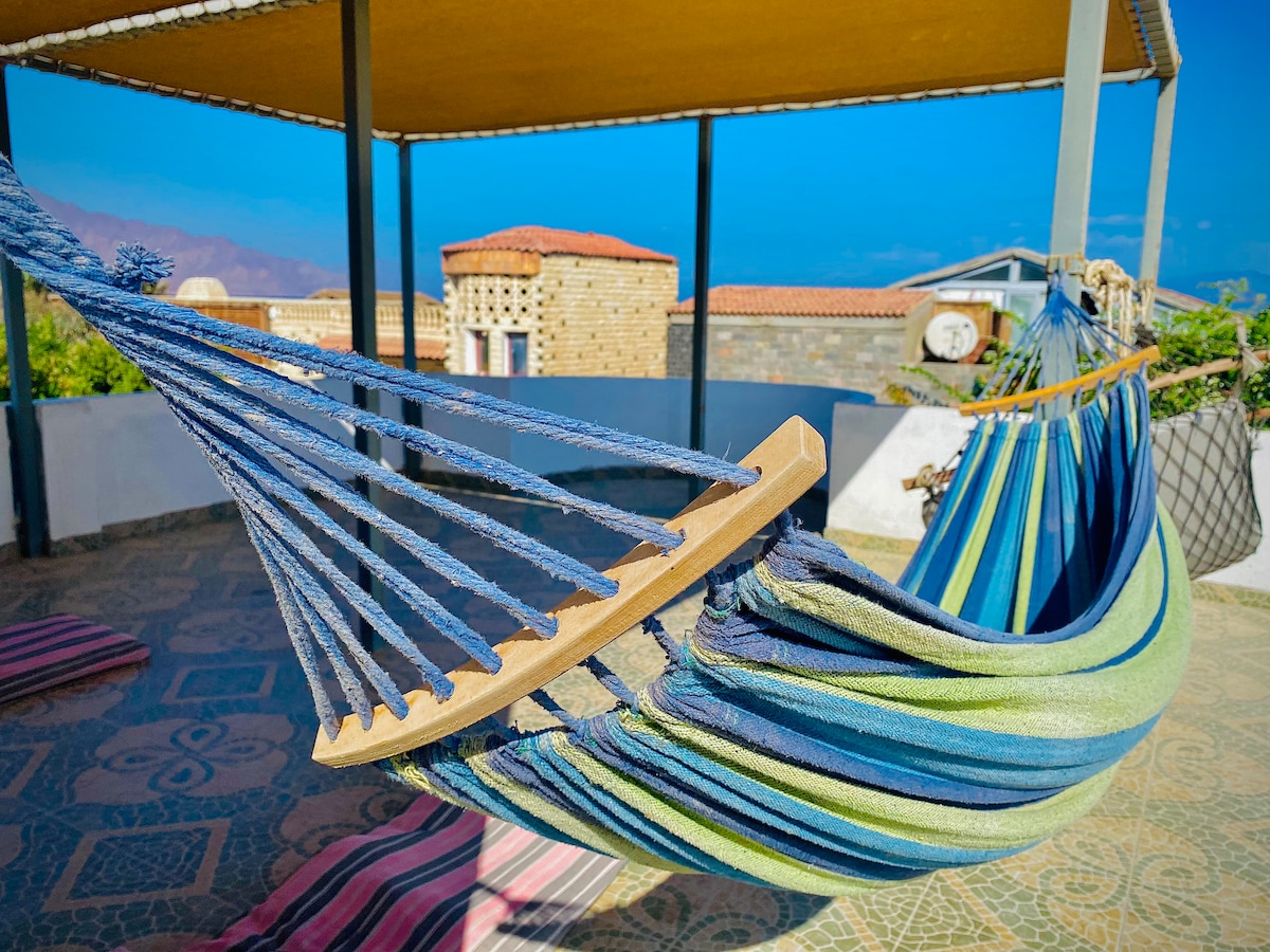 Escape to 'Formidable', a serene 1 bedroom apartment in a nice villa nestled just minutes from the beach. Our charming retreat offers stunning rooftop sea views and tranquil vibes. Enjoy three balconies capturing Dahab's beauty, perfect for your morning coffee or evening relaxation. Furnished for comfort and style, it's your ideal home away from home, only 15 minutes' walk from the town center. Experience the best of both worlds – peaceful seclusion with easy access to Dahab's vibrant heart.