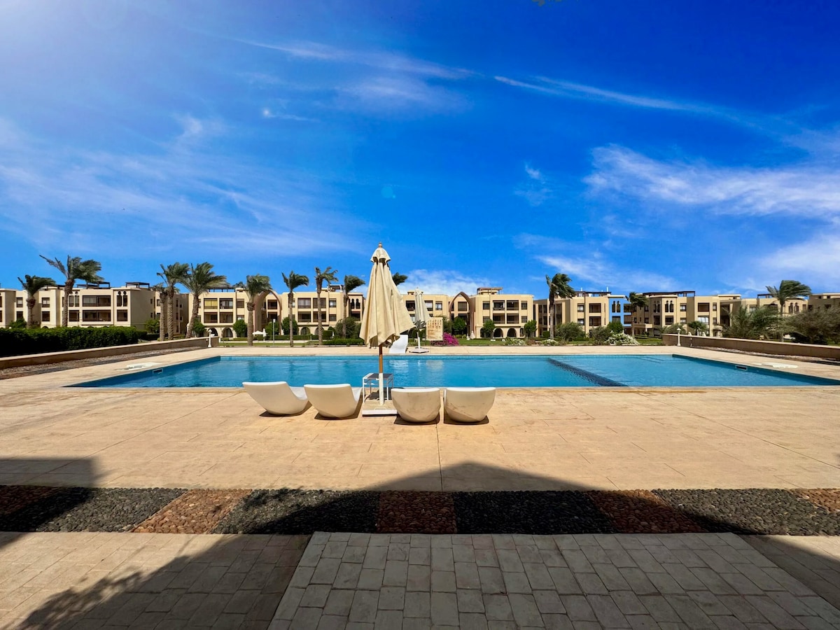 Relax in your private corner garden just steps from the resort pool and minutes to Nabq beach. Spacious 2BR unit with 2 full bathrooms (private showers + unlimited hot water) — perfect for families or two couples. 🌴 110m² private garden with direct pool access 🏊 Resort pool steps from your terrace 📶 200Mbps redundant WiFi for work & streaming 🎬 65” 4K QLED home cinema 🍳 Full kitchen + Airfryer + blender ❄️ Strong AC/heat + instant hot water 🚗 5 mins to beach & nature reserve