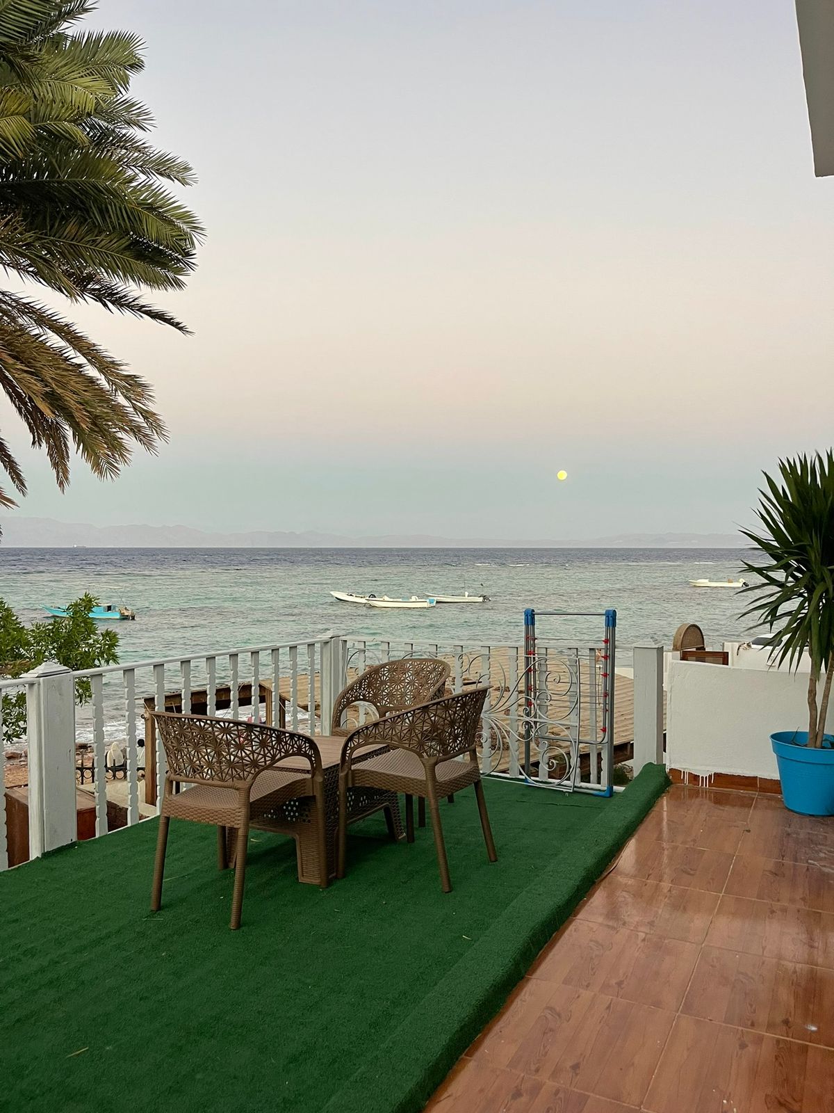 Cozy sea view rooms on Dahab First row in Lighthouse promenade with stunning sea views. Each room has a private bathroom, mini bar, AC, and Wi-Fi. Shared terrace with private sitting area for each room. No full kitchen, but includes kettle, coffee maker, cups, and plates. Some light noise from the promenade, but the atmosphere is lively and full of Dahab’s natural charm