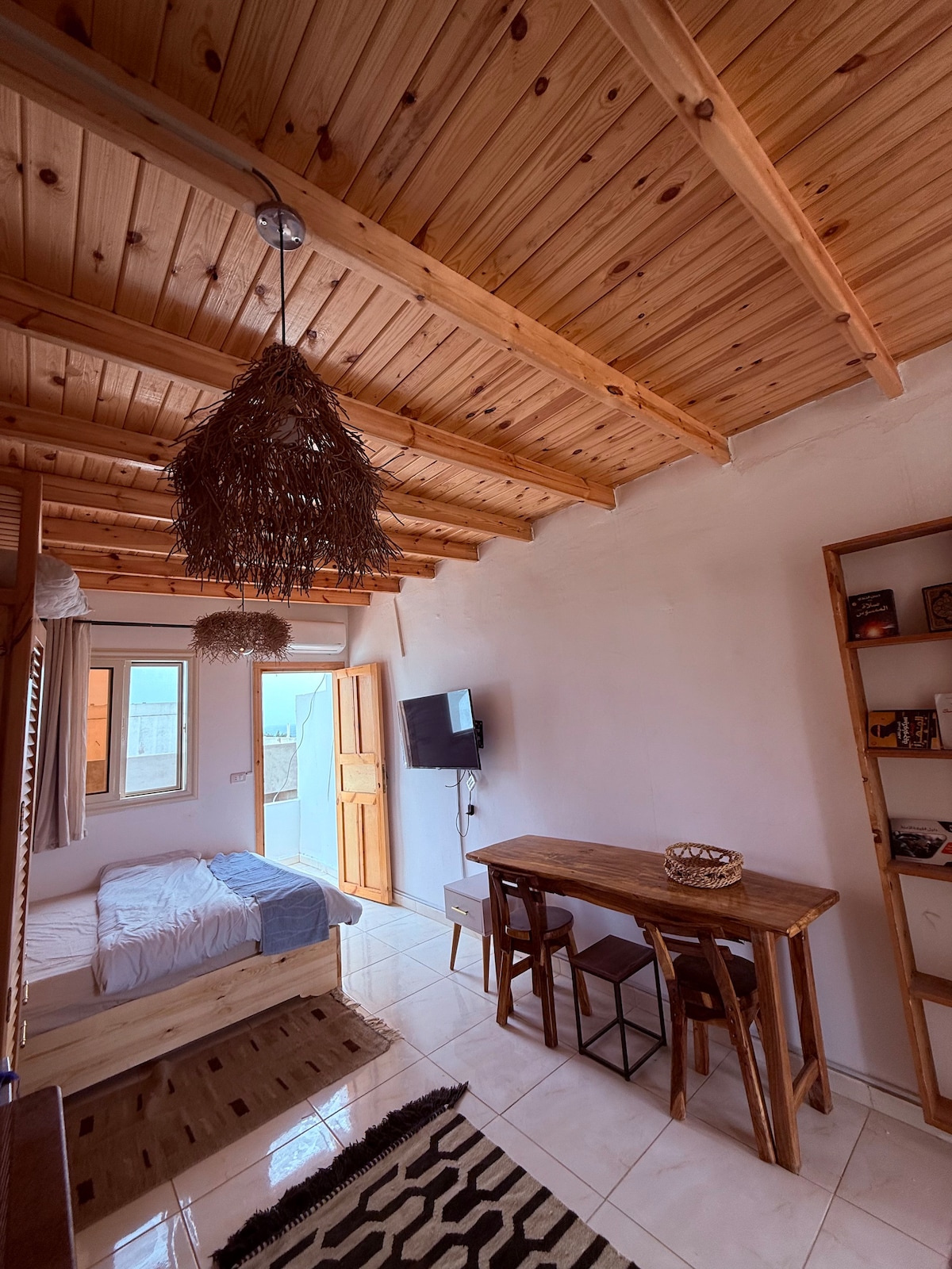 Relax and unwind in this cozy, fully furnished studio in the heart of Assala, Dahab. Enjoy amazing sea and mountain views right from your private balcony perfect for your morning coffee or a sunset wind-down. The studio features a comfy king-size bed, AC, smart TV, and a fully equipped kitchen with a stove, microwave, and all the essentials you need for a short stay or a longer escape. You're just a 2-minute walk to the sea and only 4 minutes from Assala Square