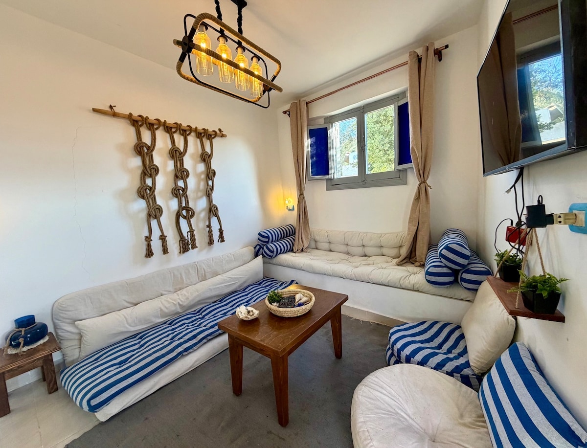 Two-bedroom house in Eel Garden, Dahab, just behind Coral Coast Hotel. Seconds from the beach, dive centers, markets, shops, cafés, and restaurants, yet quiet and private. The home offers two bedrooms with double beds, a fully equipped kitchen for daily cooking, and a comfortable living area with built-in seating. A private green garden with shaded seating adds a relaxed outdoor space. Ideal for guests looking for a central location, easy beach access, and a comfortable home base in Dahab.