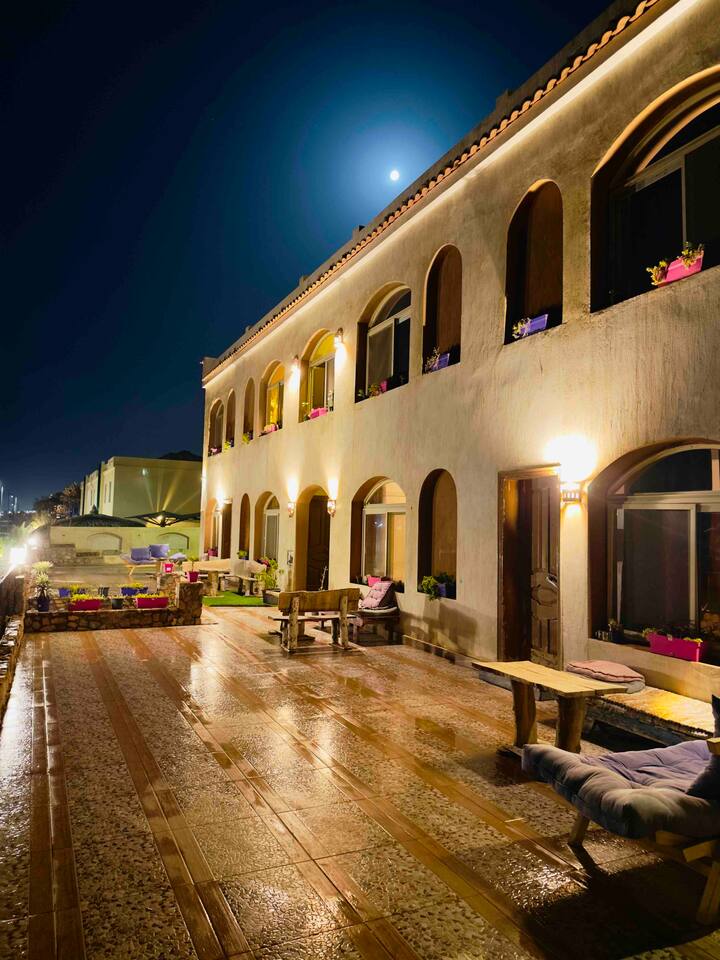 Tucked away in a quiet local neighborhood, this hidden Dahab gem offers comfort and privacy with a true sense of retreat, while still being only an 8-minute walk from the lively Lighthouse area and the beach. Wake to the sound of roosters and enjoy your morning coffee in the garden. At sunset, head up to the rooftop for sweeping views of Sinai’s changing colors, then end the evening around the peaceful garden fire under a sky full of stars, with the city glowing in the distance.