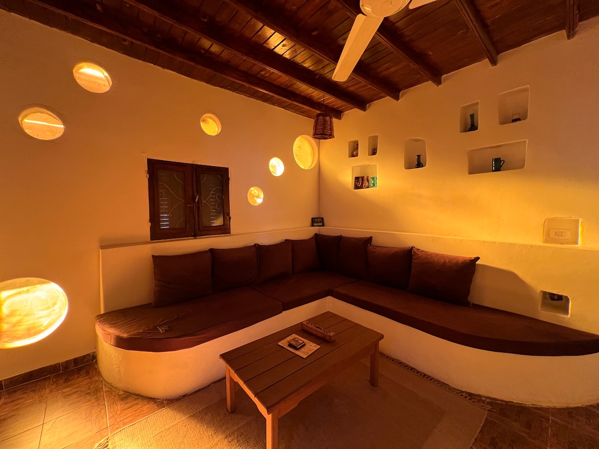 Two-bedroom house in Eel Garden, Dahab, just behind Coral Coast Hotel. Seconds from the beach, dive centers, markets, shops, cafés, and restaurants, yet quiet and private. The home offers two bedrooms with double beds, a fully equipped kitchen for daily cooking, and a comfortable living area with built-in seating. A private green garden with shaded seating adds a relaxed outdoor space. Ideal for guests looking for a central location, easy beach access, and a comfortable home base in Dahab.