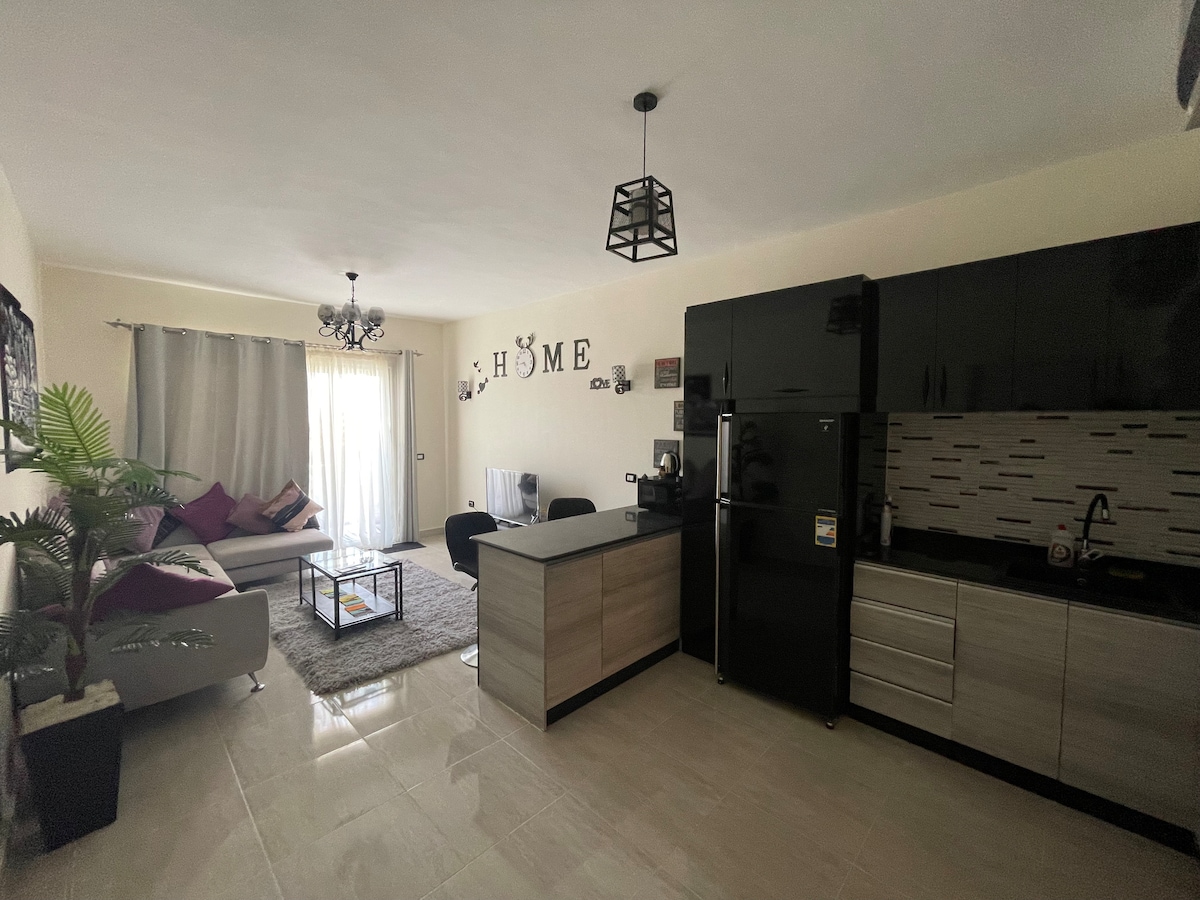 Relax and unwind in this cozy, fully furnished studio in the heart of Assala, Dahab. Enjoy amazing sea and mountain views right from your private balcony perfect for your morning coffee or a sunset wind-down. The studio features a comfy king-size bed, AC, smart TV, and a fully equipped kitchen with a stove, microwave, and all the essentials you need for a short stay or a longer escape. You're just a 2-minute walk to the sea and only 4 minutes from Assala Square