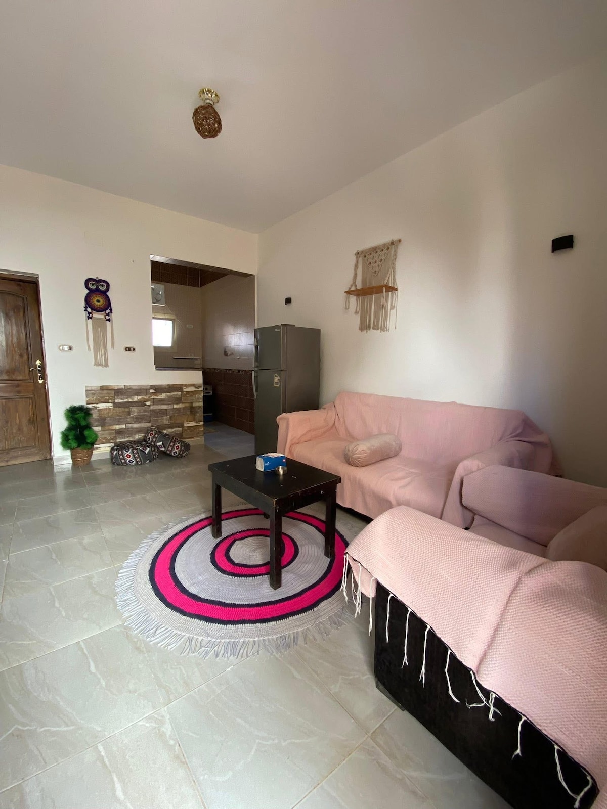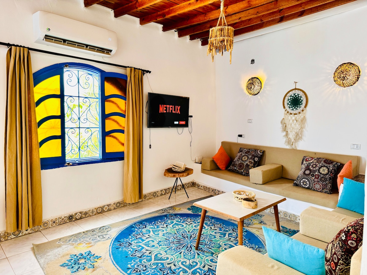 A sun lit newly renovated 2 bedroom apartment right in the center of Dahab. The house is designed in a modern/bohemian style with private garden. This house is strategically located with a 60 second walk to the beach and to all of Dahab’s famous restaurants, dive centers. The apartment has a private entrance with a spacious garden overlooking beautiful sceneries of Dahab’s mountains and palms. Step out with less than a minute walk to the beach and Dahab’s famous restaurants.