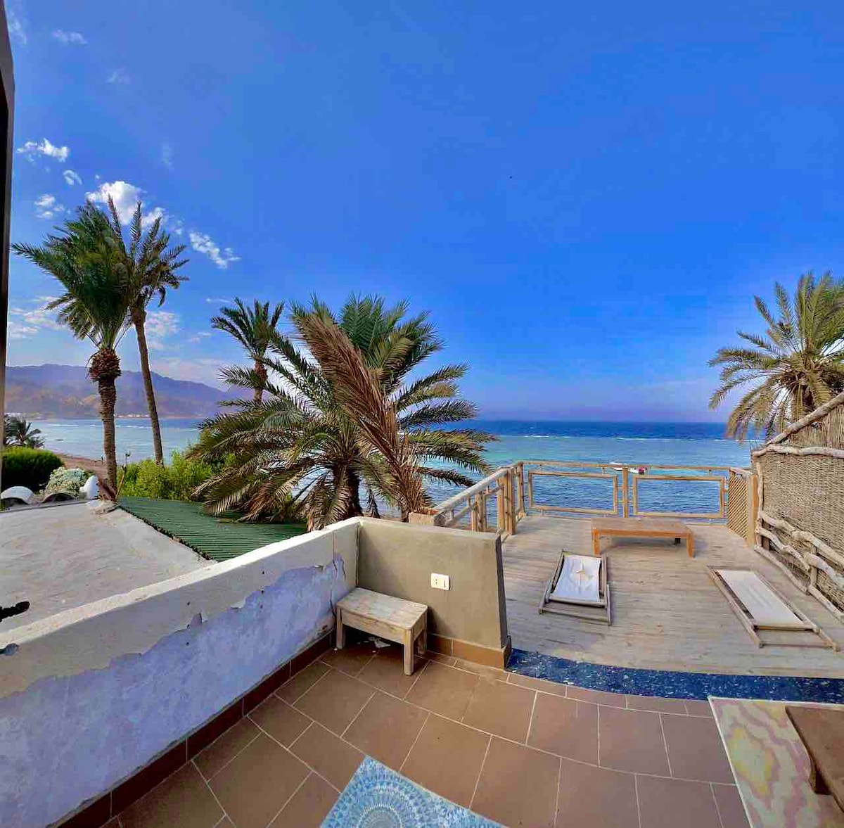 The Roof each apartment beachfront location with full view of the Red Sea and the desert mountains. Perfectly situated in the quiet area of Eel garden directly on the beach of Sinai's most treasured diving destinations. The area of the sky Beach apartment is located in a private, quiet, safe and secure area that combines modern-day comfort which gives you the perfect getaway to relax with the surrounding ambiance. Only short and scenic walk to Dahab local shops, restaurants, cafes and bars
