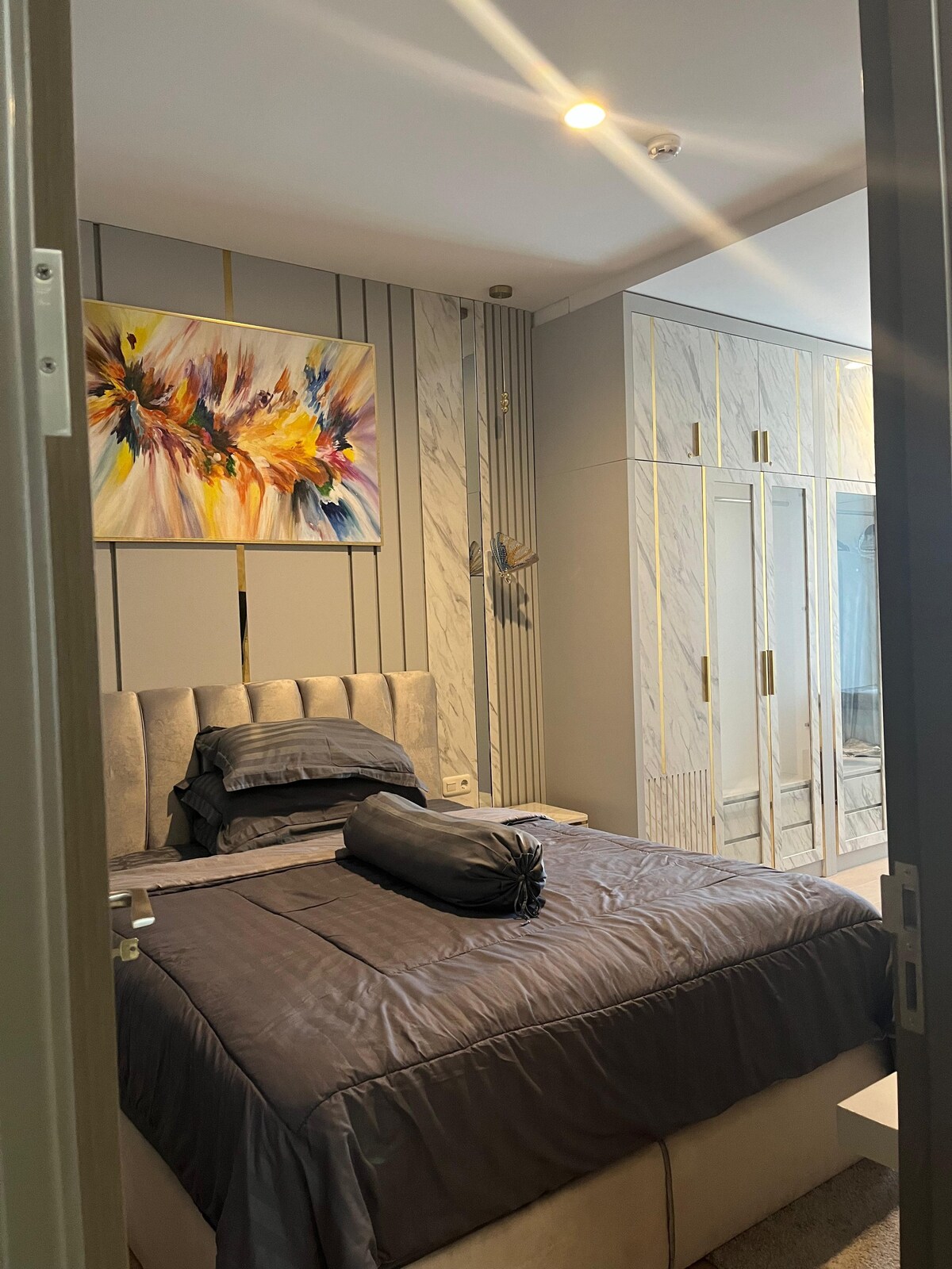 Tipe Suites 2 Bedroom Luas : 80 m² -Kulkas -mesin kopi -Dispenser -Mesin cuci -Peralatan dapur -Peralatan kebersihan -Wifi -Water heater -Balkon -TV -Setrika baju -Jemuran lipat -Sprei/bedcover -Listrik 3850 Watt Fasilitas 1. Kolam renang 2. Gym 3. Security 24Jam 4. Card access 5. Listrik & Air 7. Multi function room 8. Rooftop lantai 31 altitude *Tarif Promo September-oktober* Harian Rp1.5jt/malam Bulanan Rp25.jt/bulan 1 Tahun Rp200jt *Biaya maintenance ditanggung Pemilik Unit*