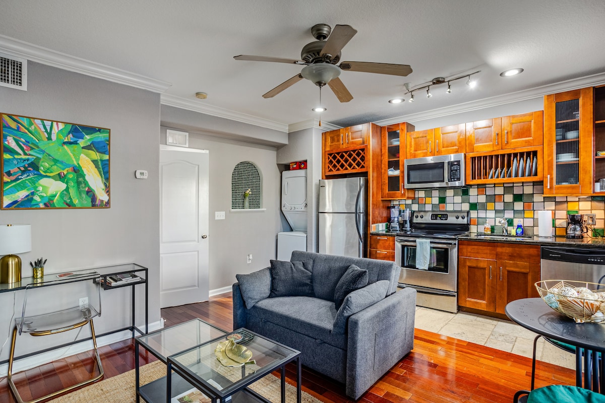Welcome to our luxurious urban studio apartment in the heart of the city! Designed to provide you with the ultimate combination of comfort style, and convenience during your stay. The design and open-concept layout maximizes space, creating a seamless flow between the living, dining, and sleeping areas. The location of our studio is unbeatable. Situated in a prime urban area, you’ll have easy access to trendy restaurants, vibrant nightlife, high-end shopping, all within approximate 5-10 minutes.