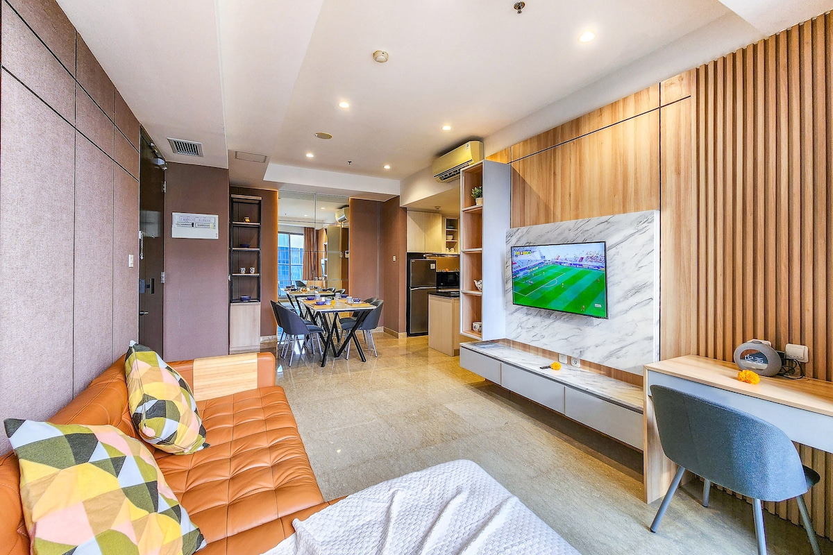 Hyva Stay- Kopenhagen Perfect place for you and your peeps who likes cool and stylish interior to stay. One of Hyva Interior project that apply Mid-century Scandinavian style that rarely found around 100 inch screen on our living area! Located on SkyHouse BSD Bristol Tower Only 1 minute walk from AEON Shopping Mall & 5 minutes drive to ICE Hall BSD, the strategic location will fulfil your stay experience more enjoyable