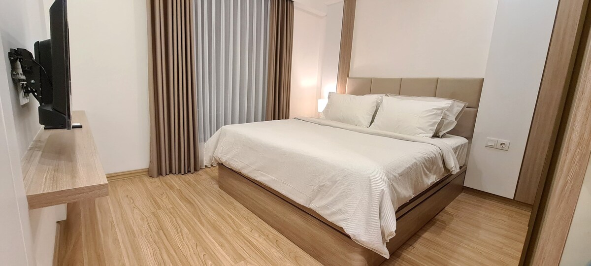Hyva Stay- Kopenhagen Perfect place for you and your peeps who likes cool and stylish interior to stay. One of Hyva Interior project that apply Mid-century Scandinavian style that rarely found around 100 inch screen on our living area! Located on SkyHouse BSD Bristol Tower Only 1 minute walk from AEON Shopping Mall & 5 minutes drive to ICE Hall BSD, the strategic location will fulfil your stay experience more enjoyable