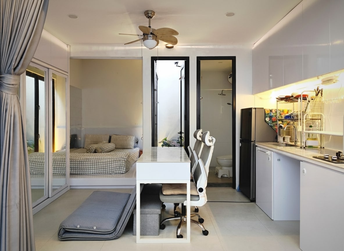 An oasis in the middle of one of Jakarta’s liveliest neighborhoods; Kemang. Designed from scratch to serve as a a stylish, cozy base to explore the city. The minimalistic, natural interior, private pool and light setup is a one off spot in south jakarta that feels like a hideaway in the centre of its beating heart. You’ll have anything you need for a short or longer term stay with a private entrance, comfortable bed(s), equipped kitchen, parking space and available assistance if needed.