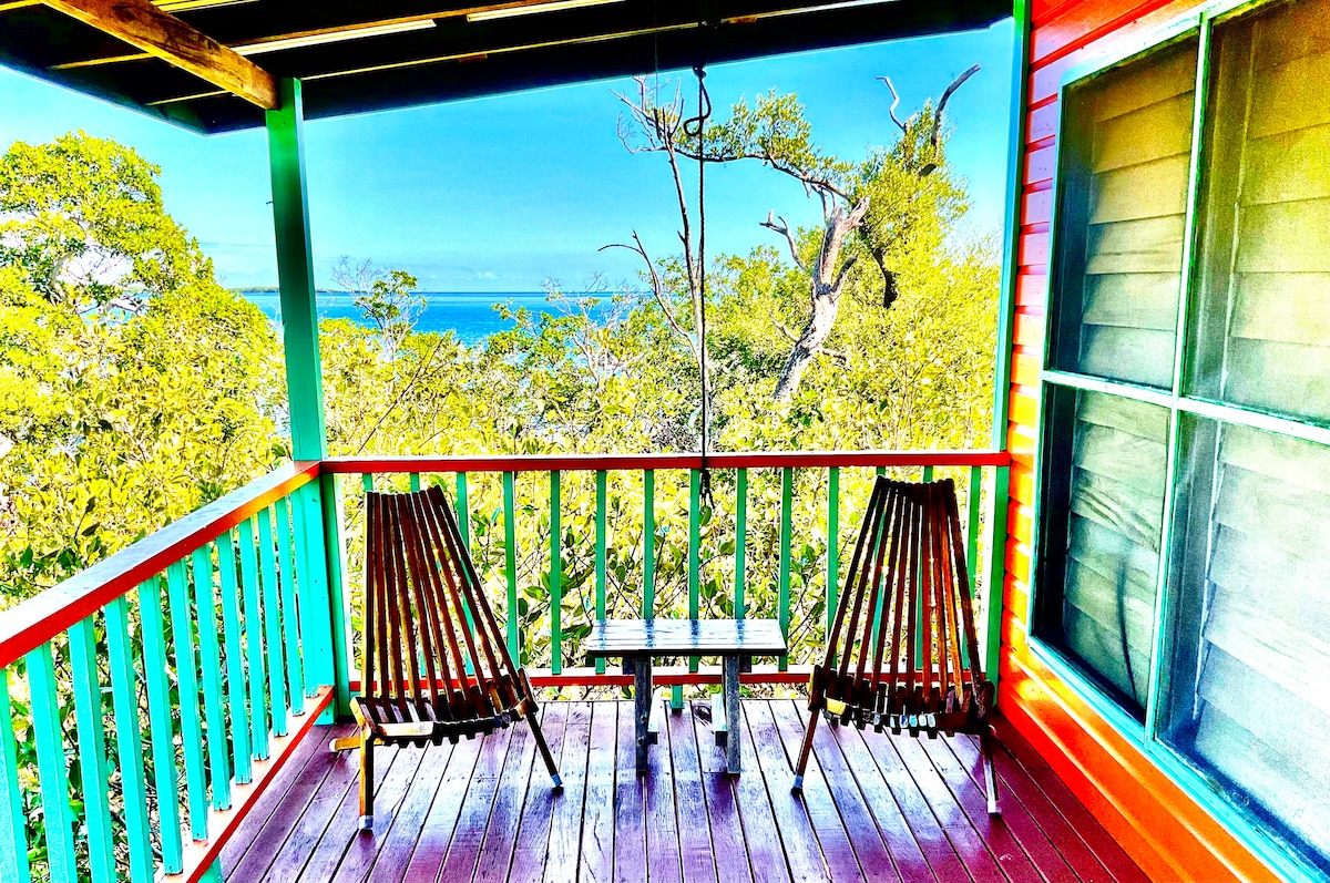 Beach front - kuknat beach cabin on tilts in the village - perfect location & amazing view in a quiet and safe neighbourhood - from here you can walk to supermarket, ATM, pharmacy, bars, or Beach Club with swimming pool at 1 minute !... enjoy tropical island life, sip your cocktail in hammock on the veranda, dive on the reef, take a nap in the AC, hike in the Jaguar reserve, watch the stars on your private piece of beach ... here is your perfect place ! No access to Ohana swimming pool
