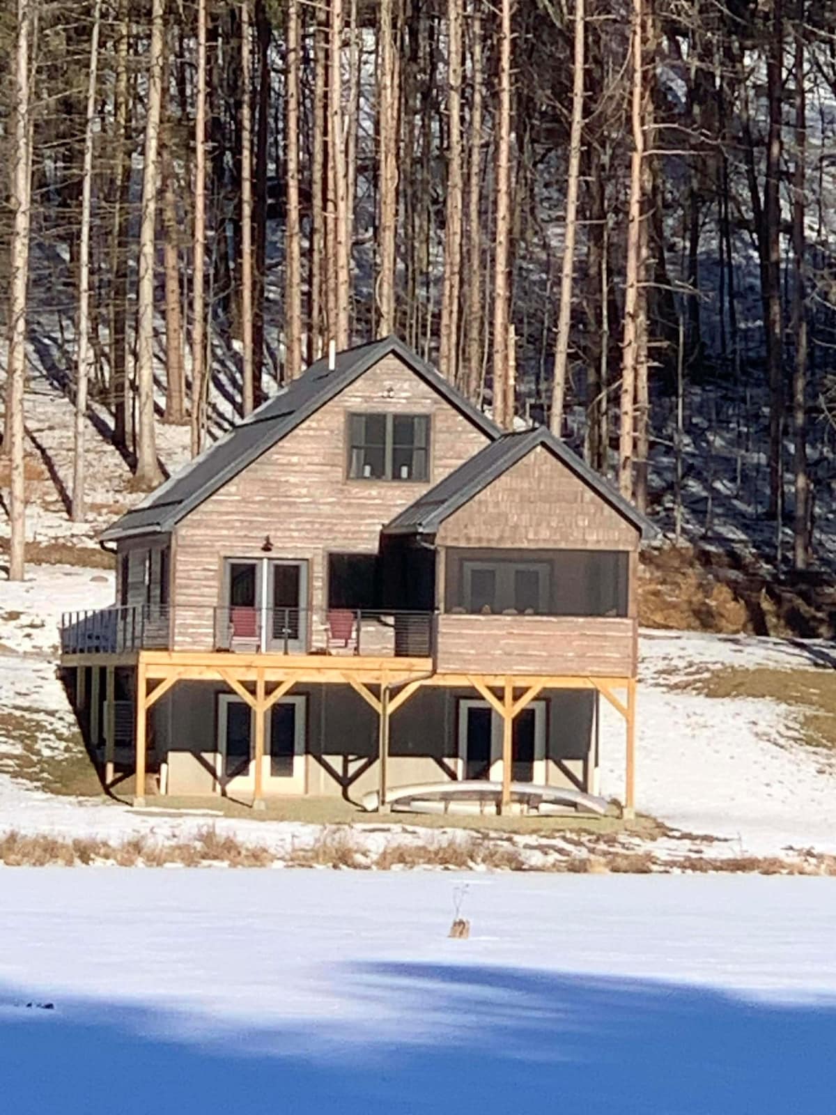 A beautiful slice of nature and unique cabin on 30 acres of land with modern ammenities. Enjoy distant views of hills through huge windows overlooking a swimming pond. It's a retreat for every season, featuring beautiful fall folliage, hiking, cross-country skiing and a lush and picturesque spring and summer. The house features a round kitchen and bedroom with a vaulted ceiling. Enjoy a giant view of the sky, fire pit by the pond, the sound of frogs, meditate, relax, or … work!