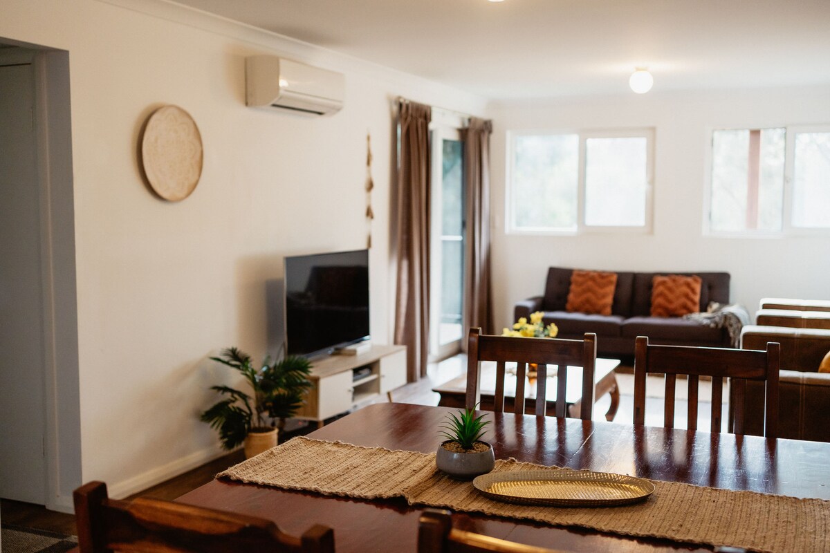 A stylish country retreat home with full spectrum infra red sauna, hot tub, Olympia massage chair, slow combustion fire, A/C, ceiling fans, views , organic fruit and vegetable gardens. 3 bedroom configure either 6 single tall beds, or 3 king bed. New renovated kitchen with modern appliances. Large verandah with plenty of table space for everyone. Stylish leather furniture, 1000 threat count sheets, extra pillows and wool quilts, gas hot water. No pets, not suitable for children under 10.