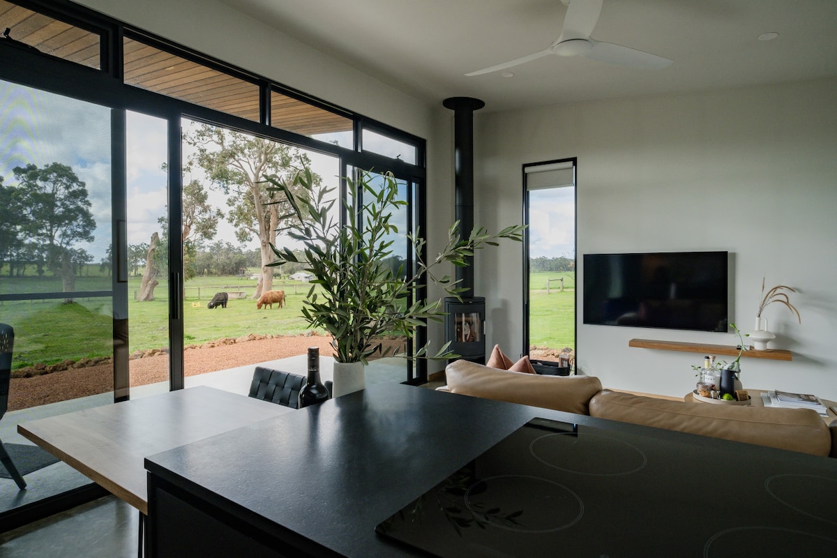 If a place was an exhale, this would be it. The space was created with slow & sustainable living in mind, giving you space to breathe & time to truly switch off. The Lookout sits in an open paddock, with 360 views of farmland. Take it all in from your bathtub or through huge windows that frame views stretching right over the wilds of Wildwood. Inside is a cocooning embrace; it’s the dreamiest sanctuary for two. Unfortunately our property is not set up to host newborns, infants or toddlers.