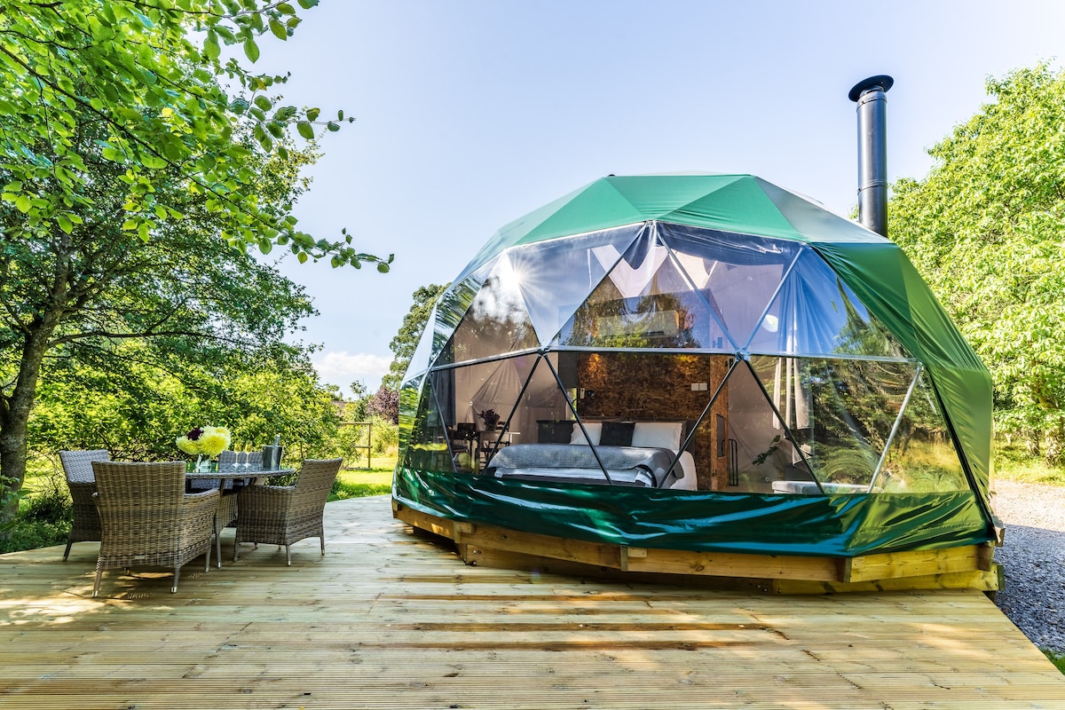 A luxurious dome nestled in private woodland and flower garden. An ideal romantic/ family stay near the Cotswolds. Enjoy the wildlife view from your king size bed, woodburning stove, additional heating and air conditioning. Relax on the private decking area, outdoor dining with a barbeque and firepit for toasting marshmallows amongst the trees. The mattresses can be brought down from the loft area for younger children. Rest, relax and reward yourself with the glamping stay with us!