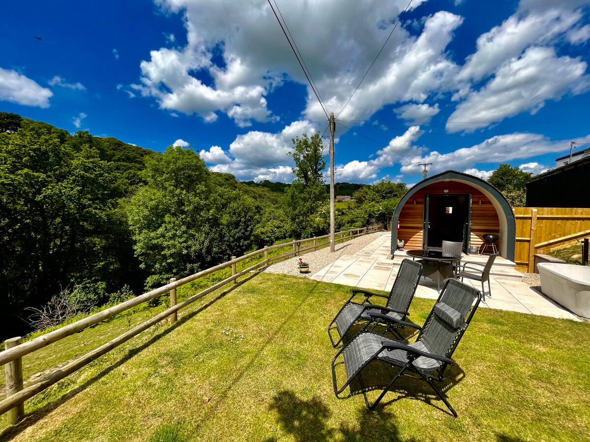 Cozy secluded INDIVIDUAL private DELUXE CEDAR GLAMPING POD/shepherd hut with OUTSIDE HOT WATER BATH in peaceful scenic valley with easy PUB walk/access. TOTALLY SELFCONTAINED, well equipped gas fired central heating, ample parking, private outside space for bike/surf gear lawn/patio area. Central to explore N.Devon & easy access within half hour to many outstanding beaches, stunning SW coastal path & beautiful Exmoor National Park. Plenty of room to park 2 cars for that romantic rendezvous!