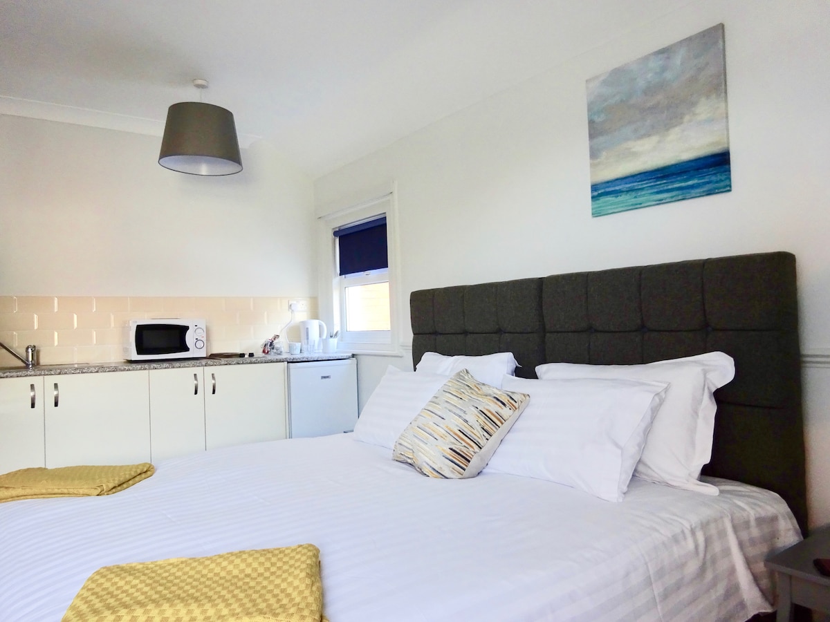 • A pleasant stroll from the Torquay Seafront • Newly Renovated • Accommodates 3 guests with a super king bed and a single sofa bed • Benefits from a sea view • Includes a fully-equipped kitchenette • Includes a private bathroom with a shower • Free Wi-fi & TV • 7 free on-site parking spaces available + additional free street parking options available nearby (limited) • A communal laundry room is available for guest use