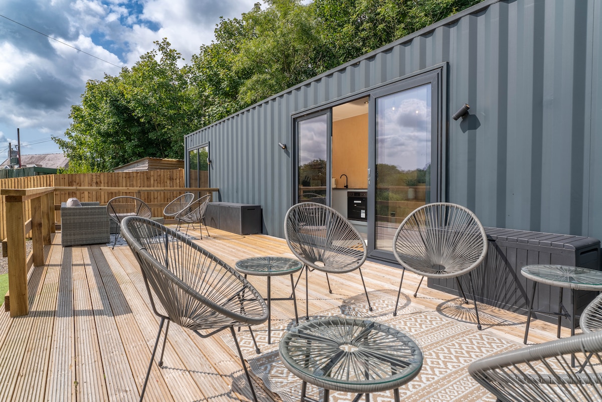 Designed to a very high specification - brand new beautiful double shipping container conversion. With very large private decking area surrounded by woodland and views of the sun setting including large dining area, seating area, built-in charcoal BBQ. Free parking for 2 cars and very cool setting - there’s nothing quite like it! Comfortably sleeps up to 6 (age 8+). Includes SpaceX’s Starlink Internet access with speeds of up to 140Mbps for those who need the ultimate in connectivity.