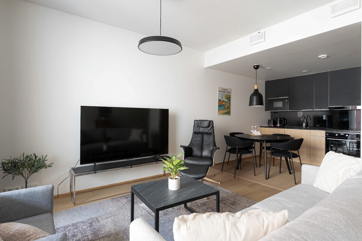 Cozy air-conditioned 74.5 m2 2BR apartment with sauna in Tammela Stadium. With elevator you can access parking hall, supermarket and restaurants. There is 1 free parking spot in the parking hall and public transport is just around the corner. City center is also nearby (1km). The apartment has high-quality materials and equipment, fast Wi-Fi and 65" TV with Netflix, as well as a large balcony with park view. This place is good for business travel or for relaxing break from everyday life.
