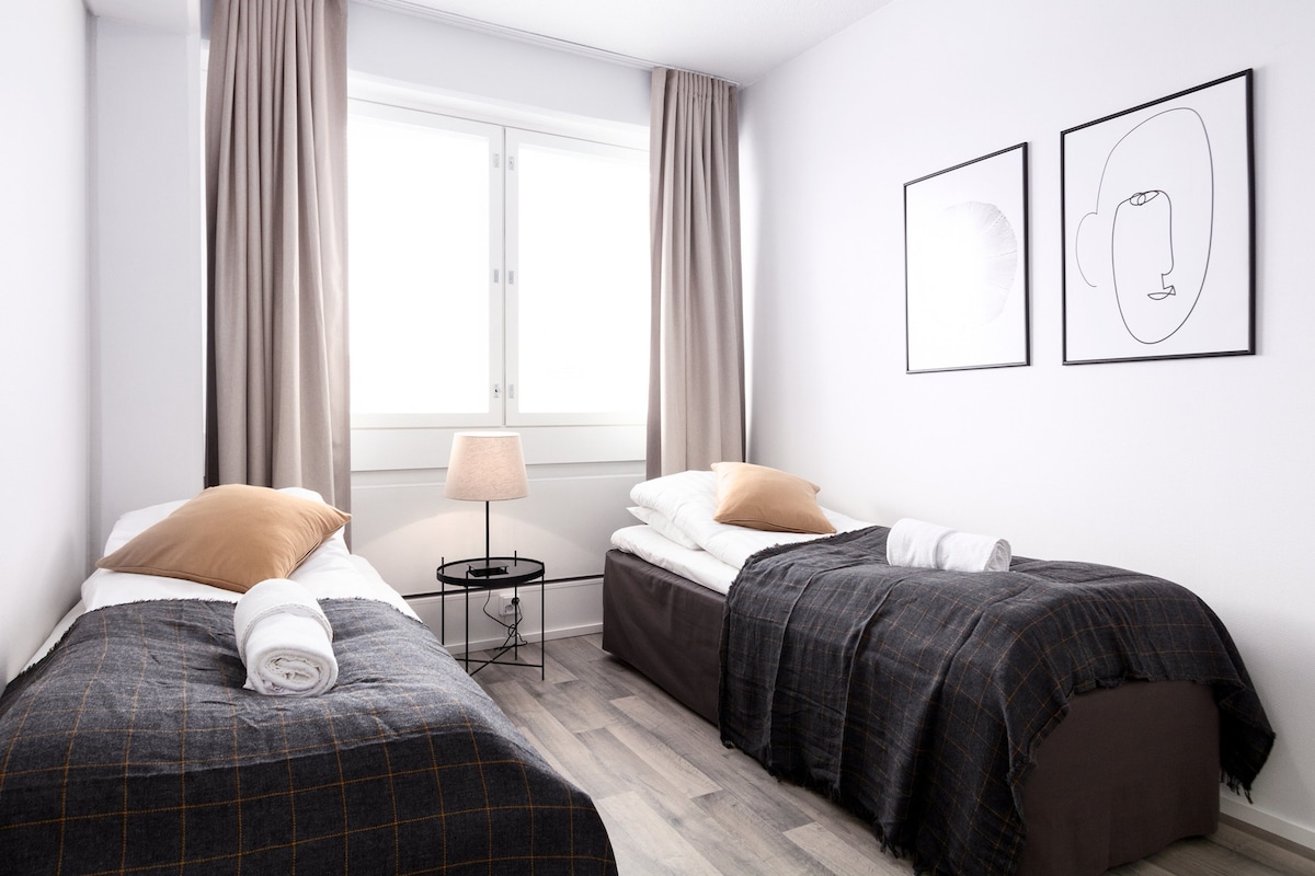 This studio for 2 includes a kitchenette equipped with a small stovetop, refrigerator, dishwasher, microwave oven, coffee machine, and water kettle. Traditional bay windows provide an enjoyable view of Turku’s market hall. There is an elegant private bathroom and shower as well as a hairdryer. For easier longer stays, this room is equipped with a washing machine. Relaxing nights are provided for by two single beds. There is a complimentary Wi-Fi connection as well as bed linen and towels.