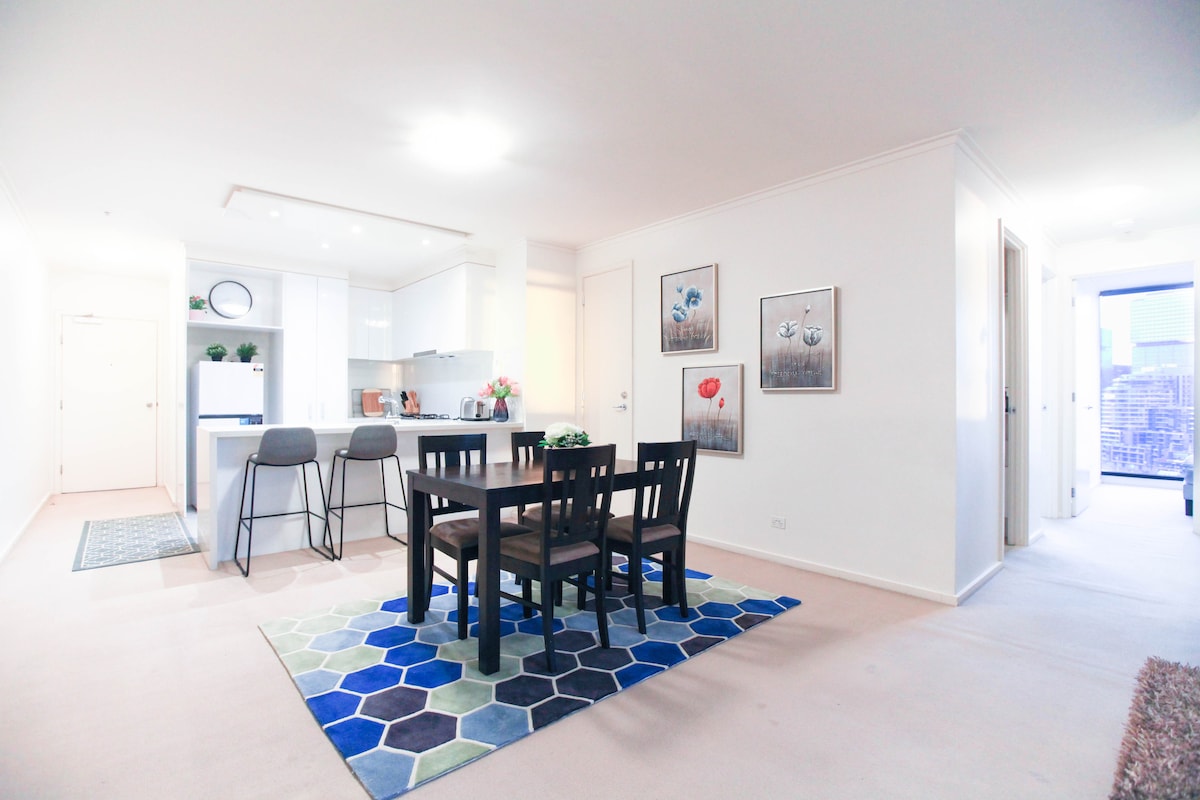 Greetings (欢迎你)! Perfect apartment in Southbank for pleasure / business. Master Bedroom with queen bed, kitchen, tasteful living area. Fully furnished & appliances. Secure Carpark (Height limit 2.1m). Located in the heart of Melbourne, next to Melbourne Convention Centre (MCEC) & over the river from CBD. River Precinct, Restaurants, Casino & Cineplex, iconic South Melbourne Markets. Heated Indoor Pool, Spa & Gym. Trams directly outside the building. Personal check in whenever possible.
