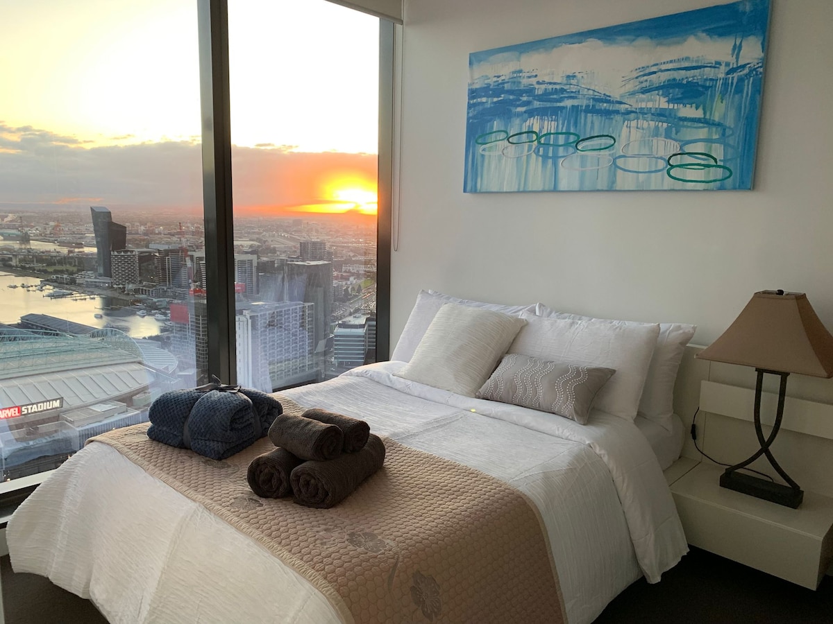 Enjoy a clean, relaxed experience at this centrally located place. Try the top floor! In Melbourne CBD this place really stands out. Phenomenal sunsets! Unencumbered views to the bay, rivers, Docklands, WestGate & Bolte Bridges, distant hills, city lights. Convenient. Walk to Crown, ConventionC, Marvel Stadium, Southern Cross Station, il Mercato Centrale. Great amenities: Pool/spa/sauna/gym. 1x Quality queen bed + Quality 2x sofa beds, linen, Hot shower, Kitchen, Ergonomic Desk, AppleTV